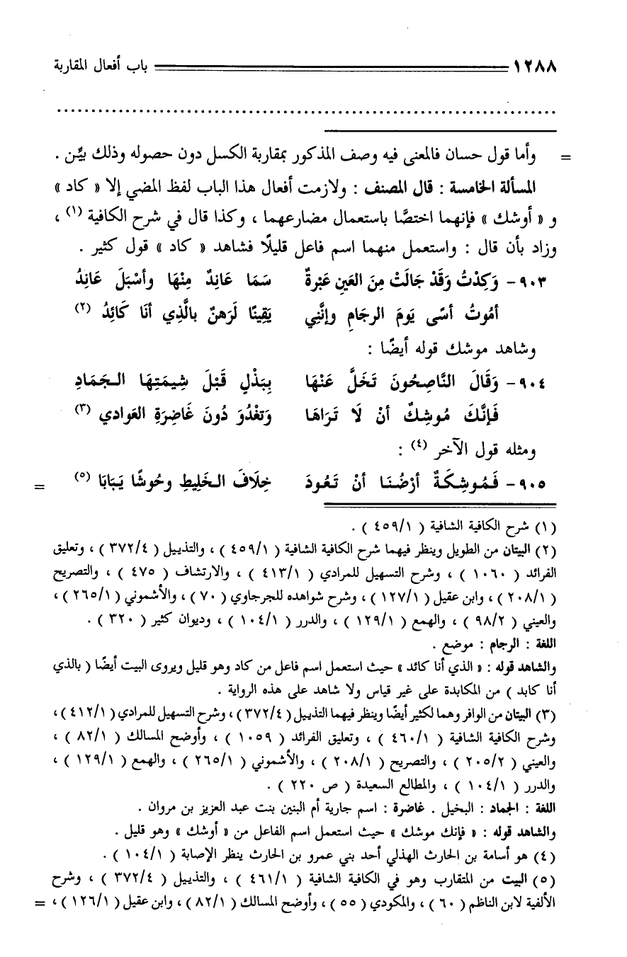 (¬5) البيت من المتقارب وهو في الكافية الشافية (1/ 461)، والتذييل (4/ 372)، وشرح الألفية لابن الناظم (60)، والمكودي (55)، وأوضح المسالك (1/ 82)، وابن عقيل (1/ 126)، -
