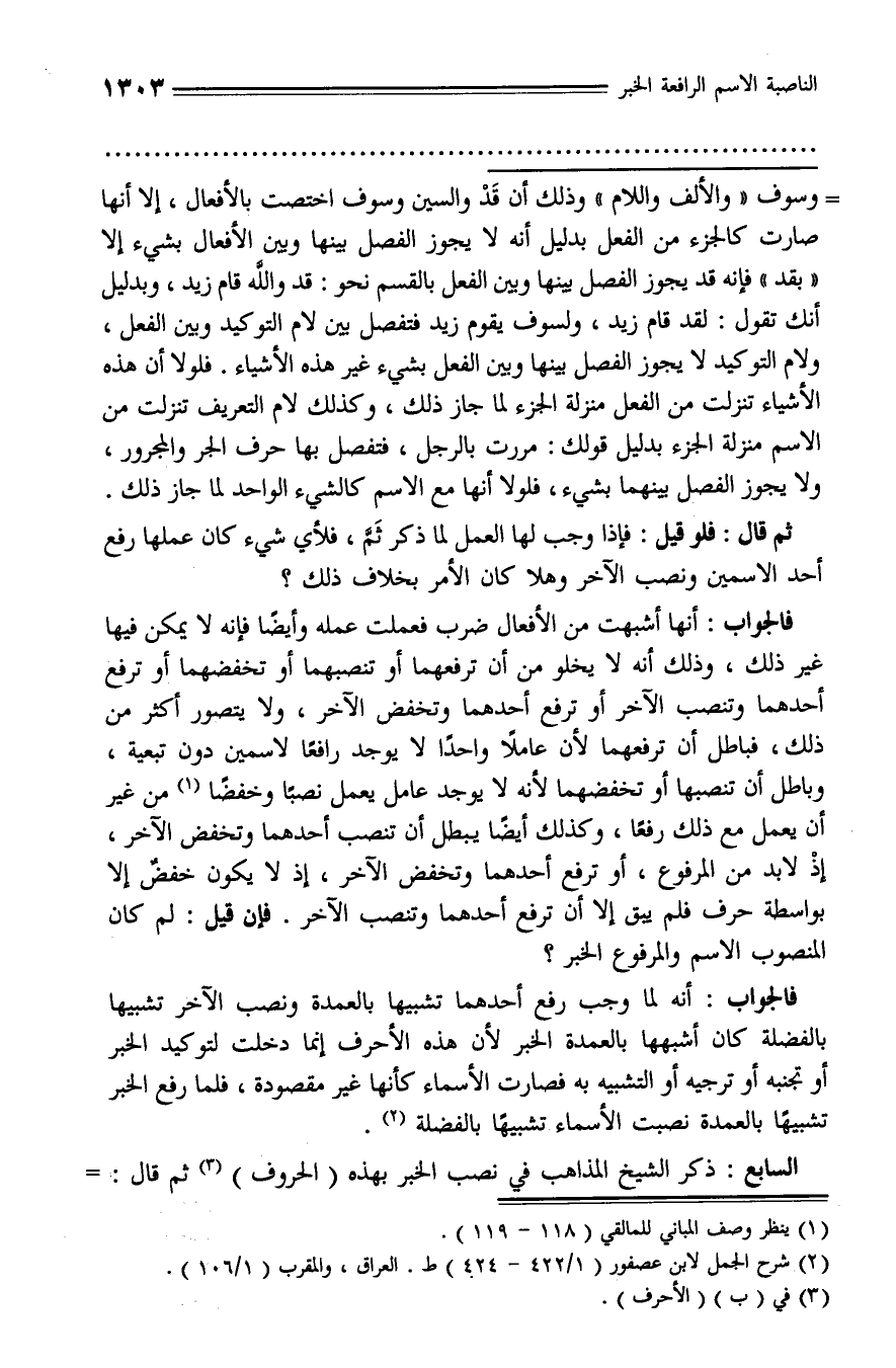 السابع: ذكر الشيخ المذاهب في نصب الخبر بهذه (الحروف) (¬3) ثم قال: -