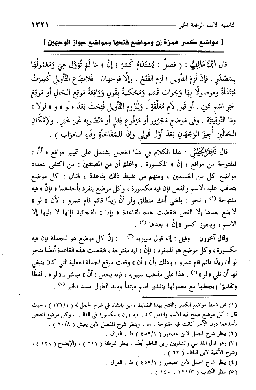 قال ابن مالك: (فصل: يستدام كسر «إنّ» ما لم تؤوّل هي ومعمولها بمصدر. فإن لزم التأويل؛ لزم الفتح. وإلّا فوجهان. فلا متناع التّأويل كسرت مبتدأة وموصولا بها وجواب قسم ومحكية بقول وواقعة موقع الحال أو موقع خبر اسم عين. أو قبل لام معلّقة. وللزوم التّأويل فتحت بعد «لو» و «لولا» وما التّوقيتيّة. وفي موضع مجرور أو مرفوع فعل أو منصوبه غير خبر. ولإمكان الحالين أجيز الوجهان بعد أوّل قولي وإذا للمفاجأة وفاء الجواب).
