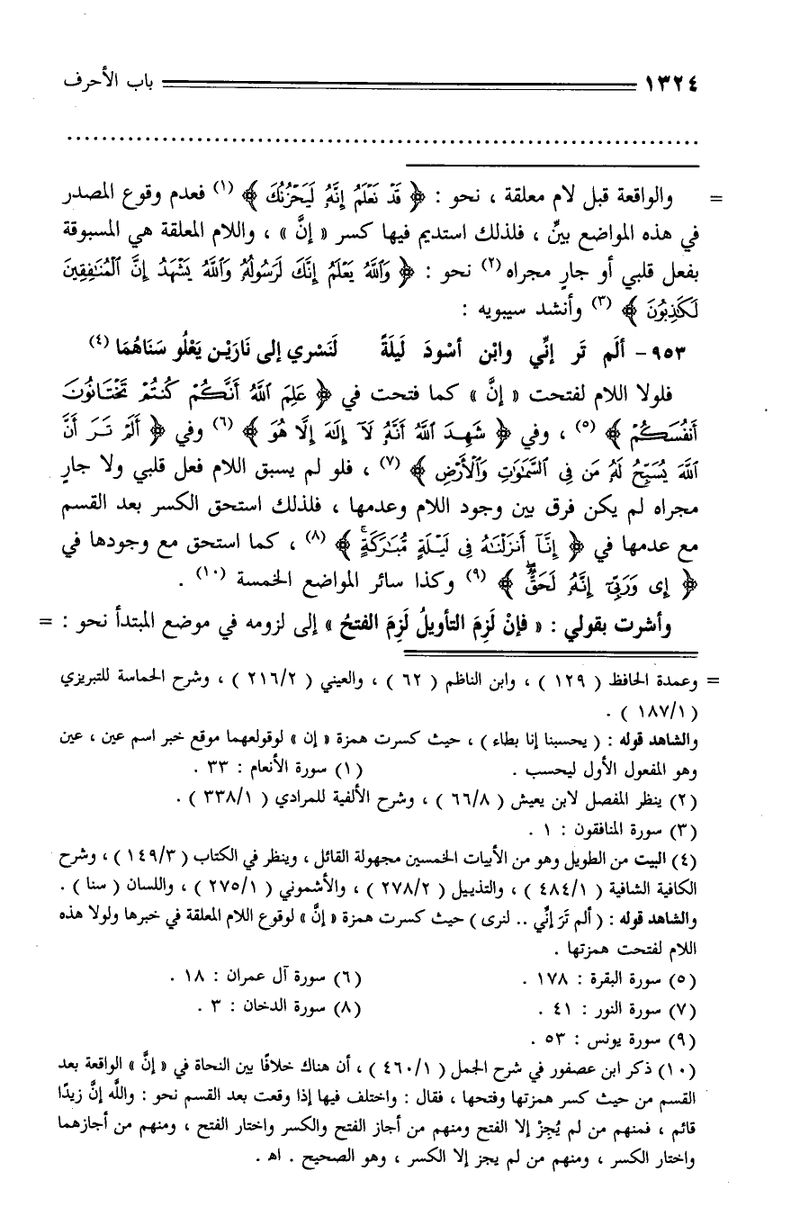 (¬10) ذكر ابن عصفور في شرح الجمل (1/ 460)، أن هناك خلافا بين النحاة في «إنّ» الواقعة بعد القسم من حيث كسر همزتها وفتحها، فقال: واختلف فيها إذا وقعت بعد القسم نحو: والله إنّ زيدا قائم، فمنهم من لم يجز إلا الفتح ومنهم من أجاز الفتح والكسر واختار الفتح، ومنهم من أجازهما واختار الكسر، ومنهم من لم يجز إلا الكسر، وهو الصحيح. اه.