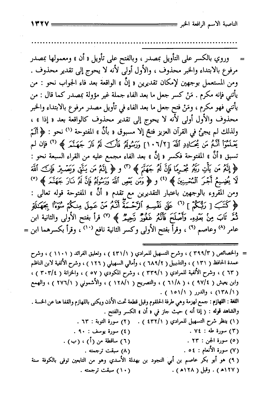 مرفوع بالابتداء والخبر محذوف والأول أولى لأنه لا يحوج إلى تقدير محذوف كالواقعة بعد «إذا»، ولذلك لم يجئ في القرآن العزيز فتح إلا مسبوق «بأنّ» المفتوحة (¬1) نحو: أَلَمْ يَعْلَمُوا أَنَّهُ مَنْ يُحادِدِ اللَّهَ [2/ 106] وَرَسُولَهُ فَأَنَّ لَهُ نارَ جَهَنَّمَ (¬2) فإن لم تسبق «أنّ» المفتوحة فكسر «إنّ» بعد الفاء مجمع عليه من القراء السبعة نحو:
