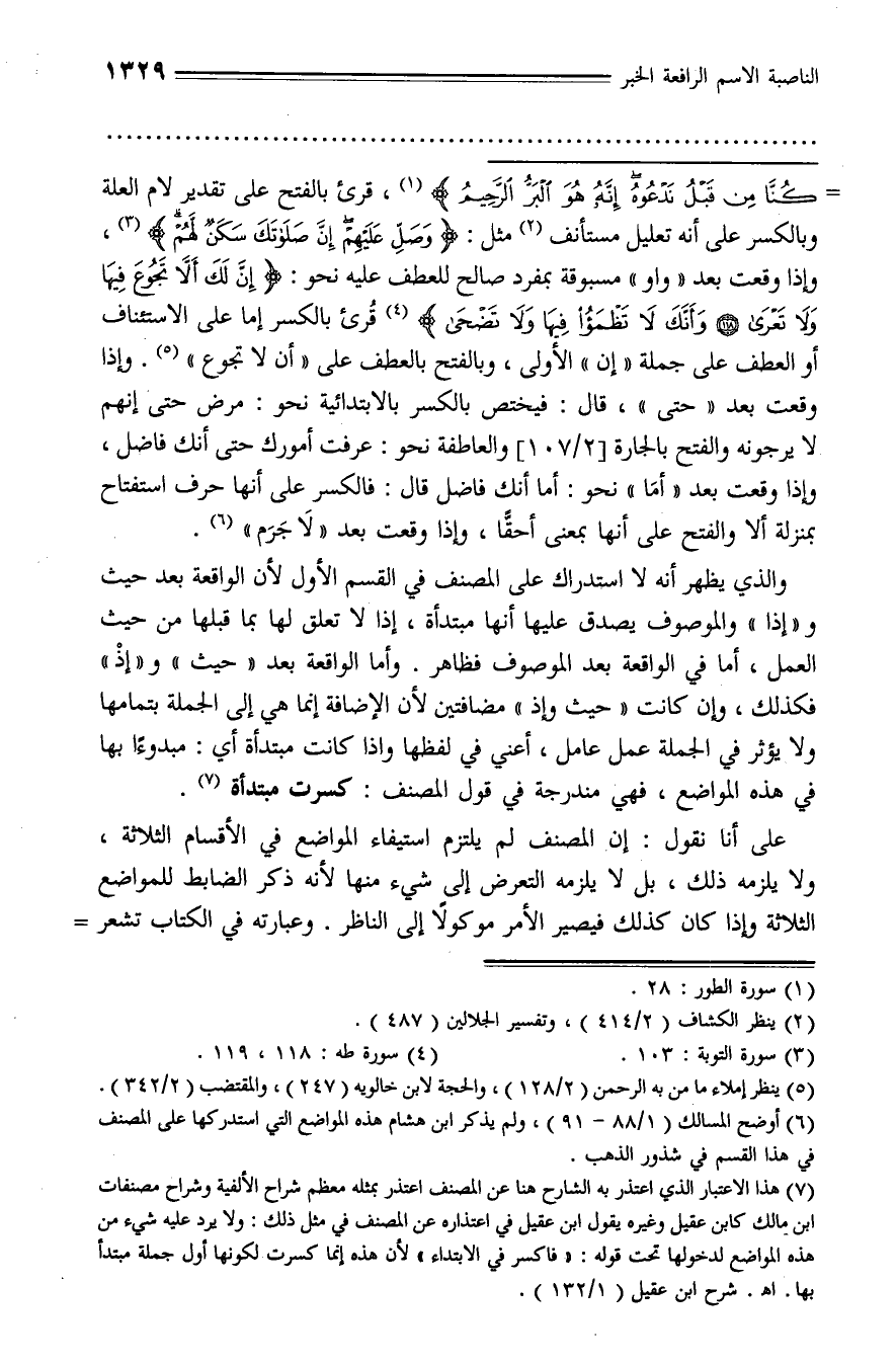 (¬7) هذا الاعتبار الذي اعتذر به الشارح هنا عن المصنف اعتذر بمثله معظم شراح الألفية وشراح مصنفات ابن مالك كابن عقيل وغيره يقول ابن عقيل في اعتذاره عن المصنف في مثل ذلك: ولا يرد عليه شيء من هذه المواضع لدخولها تحت قوله: «فاكسر في الابتداء» لأن هذه إنما كسرت لكونها أول جملة مبتدأ بها. اه. شرح ابن عقيل (1/ 132).