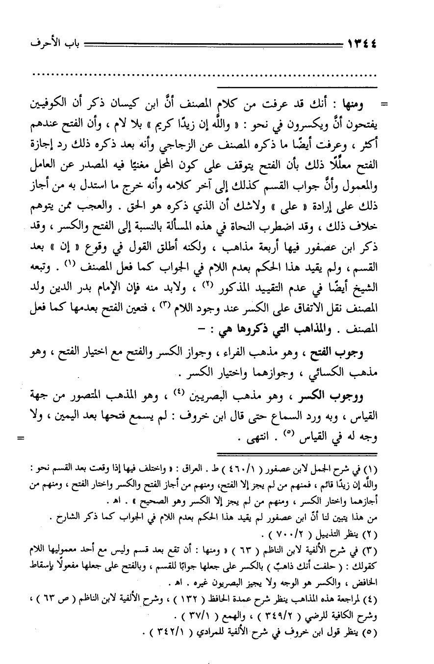 ومنها: أنك قد عرفت من كلام المصنف أنّ ابن كيسان ذكر أن الكوفيين يفتحون أنّ ويكسرون في نحو: «والله إن زيدا كريم» بلا لام، وأن الفتح عندهم أكثر، وعرفت أيضا ما ذكره المصنف عن الزجاجي وأنه بعد ذكره ذلك رد إجازة الفتح معلّلا ذلك بأن الفتح يتوقف على كون المحل مغنيا فيه المصدر عن العامل والمعمول وأنّ جواب القسم كذلك إلى آخر كلامه وأنه خرج ما استدل به من أجاز ذلك على إرادة «على» ولا شك أن الذي ذكره هو الحق. والعجب ممن يتوهم خلاف ذلك، وقد اضطرب النحاة في هذه المسألة بالنسبة إلى الفتح والكسر، وقد ذكر ابن عصفور فيها أربعة مذاهب، ولكنه أطلق القول في وقوع «إن» بعد القسم، ولم يقيد هذا الحكم بعدم اللام في الجواب كما فعل المصنف (¬1). وتبعه الشيخ أيضا في عدم التقييد المذكور (¬2)، ولا بد منه فإن الإمام بدر الدين ولد المصنف نقل الاتفاق على الكسر عند وجود اللام (¬3)، فتعين الفتح بعدمها كما فعل المصنف. والمذاهب التي ذكروها هي: -