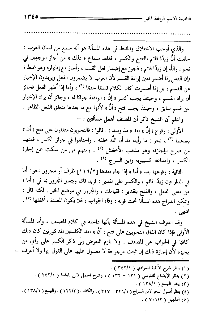 وقد اعترف الشيخ في هذه المسألة بأنها داخلة في كلام المصنف، وأما المسألة الأولى فإذا كان اتفاق النحويين على فتح «أنّ» بعد الكلمتين المذكورتين كان ذلك كافيا في الجواب عن المصنف. ولا يلزم التعرض إلى ذكر الكسر على رأي من يجيزه لأن إجازة ذلك إن ثبتت مرجوحة لا معمول عليها على القول بها ولا أعرف -