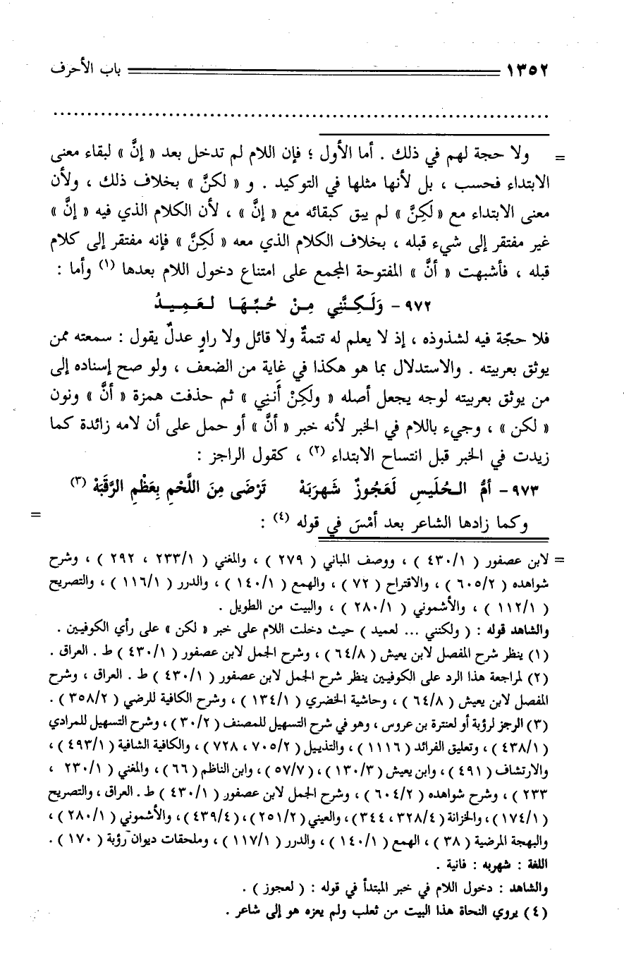 ولا حجة لهم في ذلك. أما الأول؛ فإن اللام لم تدخل بعد «إنّ» لبقاء معنى الابتداء فحسب، بل لأنها مثلها في التوكيد. و «لكنّ» بخلاف ذلك، ولأن معنى الابتداء مع «لكنّ» لم يبق كبقائه مع «إنّ»، لأن الكلام الذي فيه «إنّ» غير مفتقر إلى شيء قبله، بخلاف الكلام الذي معه «لكنّ» فإنه مفتقر إلى كلام قبله، فأشبهت «أنّ» المفتوحة المجمع على