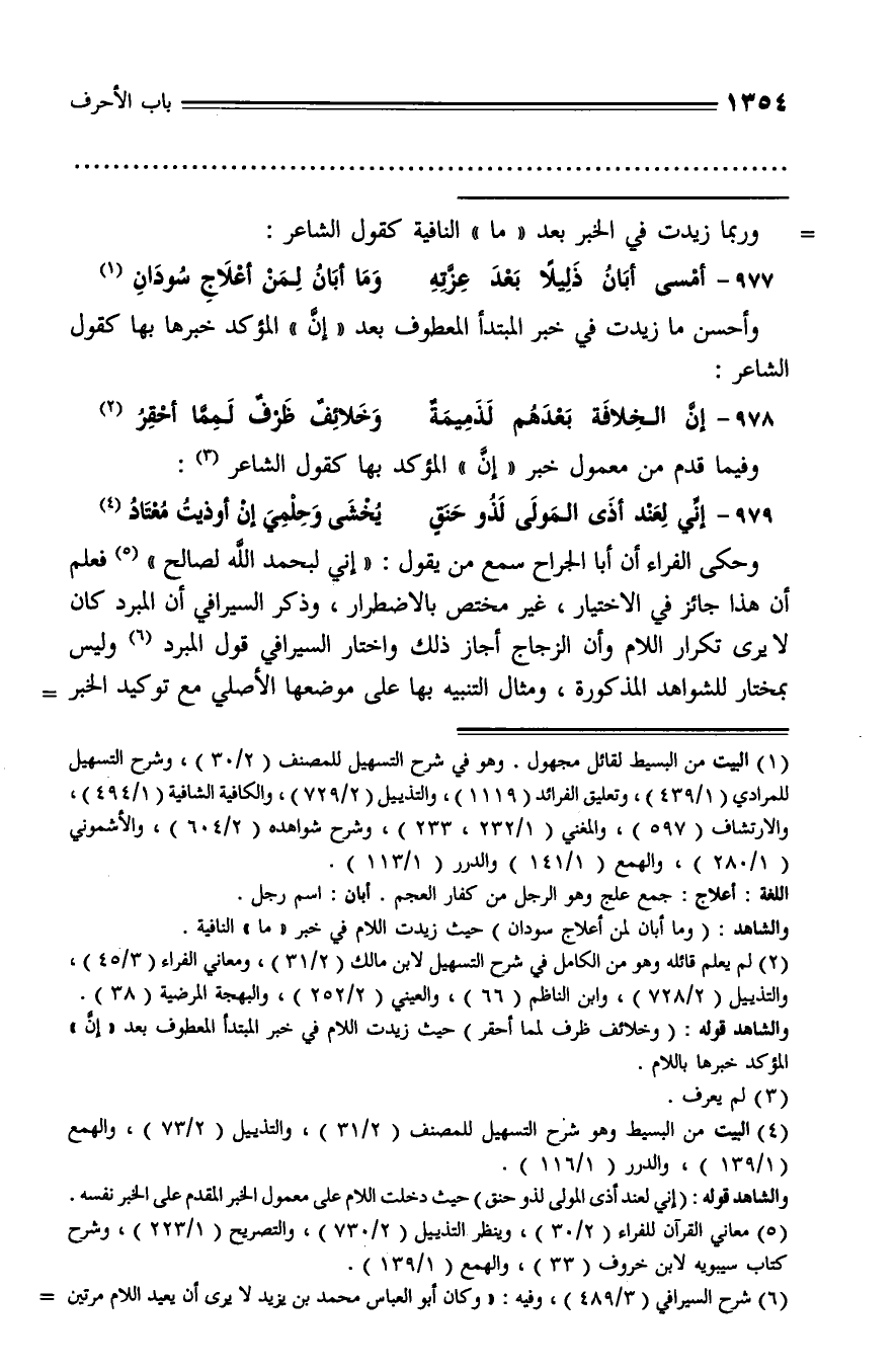 (¬6) شرح السيرافي (3/ 489)، وفيه: «وكان أبو العباس محمد بن يزيد لا يرى أن يعيد اللام مرتين -