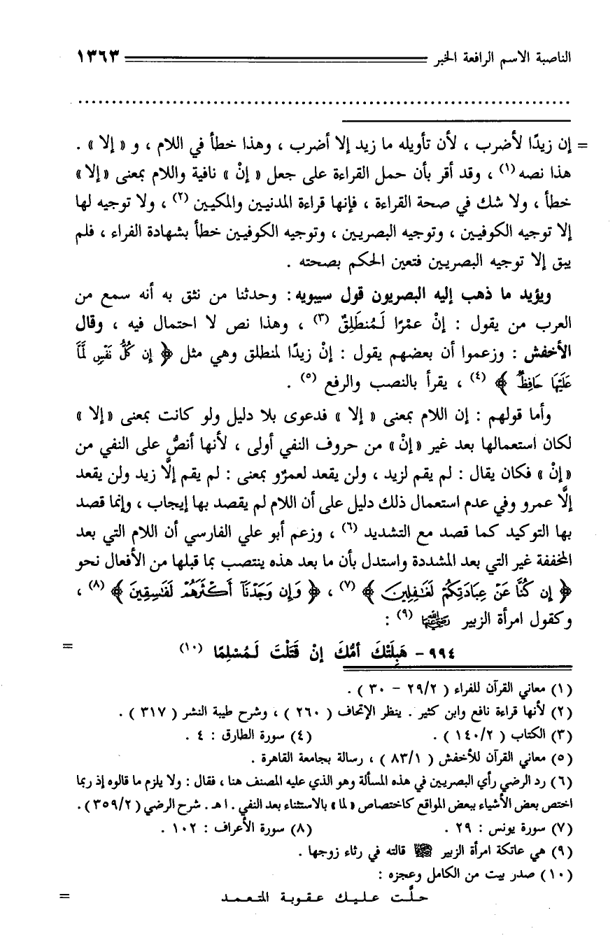 هذا نصه (¬1)، وقد أقر بأن حمل القراءة على جعل «إن» نافية واللام بمعنى «إلا» خطأ، ولا شك في صحة القراءة، فإنها قراءة المدنيين والمكيين (¬2)، ولا توجيه لها إلا توجيه الكوفيين، وتوجيه البصريين، وتوجيه الكوفيين خطأ بشهادة الفراء، فلم يبق إلا توجيه البصريين فتعين الحكم بصحته.