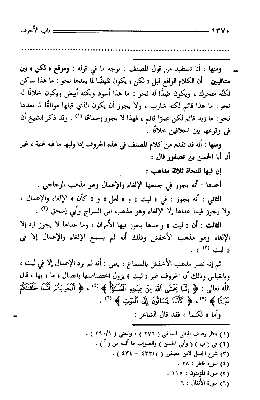 ثم إنه نصر مذهب الأخفش بالسماع، يعني: أنه لم يرد الإعمال إلا في ليت، وبالقياس وذلك أن الحروف غير «ليت» يزول اختصاصها باتصال «ما» بها، قال الله تعالى: إِنَّما يَخْشَى اللَّهَ مِنْ عِبادِهِ الْعُلَماءُ (¬4)، أَفَحَسِبْتُمْ أَنَّما خَلَقْناكُمْ عَبَثاً (¬5)، كَأَنَّما يُساقُونَ إِلَى الْمَوْتِ (¬6).