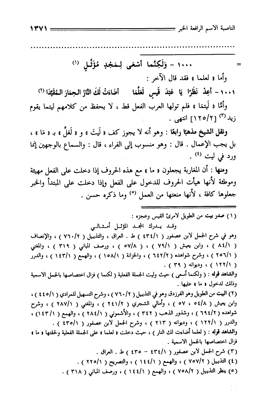 ونقل الشيخ مذهبا رابعا: وهو أنه لا يجوز كف «ليت» و «لعلّ» بـ «ما»، بل يجب الإعمال. قال: وهو منسوب إلى الفراء، قال: والسماع بالوجهين إنما ورد في ليت (¬4).