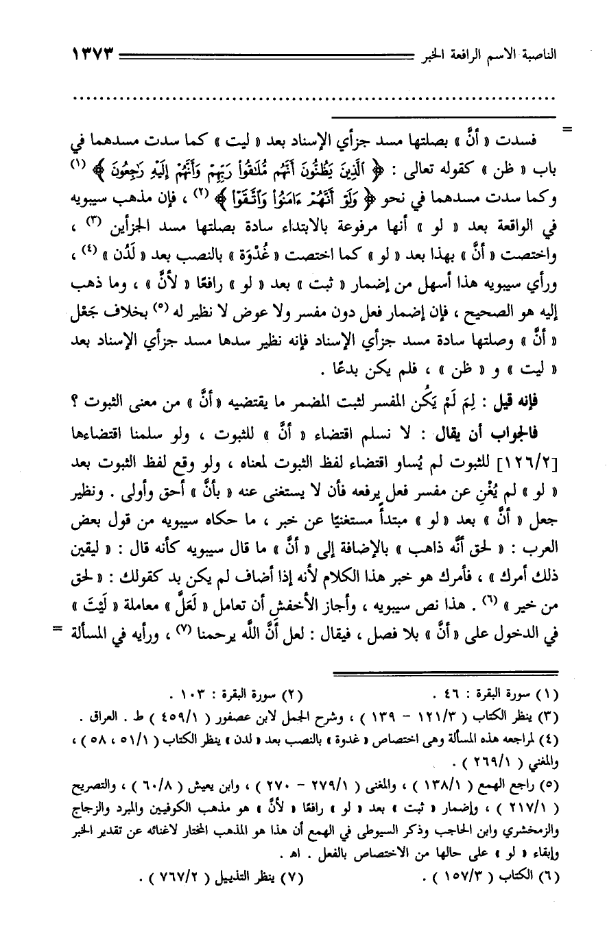 فسدت «أنّ» بصلتها مسد جزأي الإسناد بعد «ليت» كما سدت مسدهما في باب «ظن» كقوله تعالى: الَّذِينَ يَظُنُّونَ أَنَّهُمْ مُلاقُوا رَبِّهِمْ وَأَنَّهُمْ إِلَيْهِ راجِعُونَ (¬1) وكما سدت مسدهما في نحو وَلَوْ أَنَّهُمْ آمَنُوا وَاتَّقَوْا (¬2)، فإن مذهب سيبويه في الواقعة بعد «لو» أنها مرفوعة بالابتداء سادة بصلتها مسد الجزأين (¬3)، واختصت «أنّ» بهذا بعد «لو» كما اختصت «غدوة» بالنصب بعد «لدن» (¬4)، ورأي سيبويه هذا أسهل من إضمار «ثبت» بعد «لو» رافعا «لأنّ»، وما ذهب إليه هو الصحيح، فإن إضمار فعل دون مفسر ولا عوض لا نظير له (¬5) بخلاف جعل «أنّ» وصلتها سادة