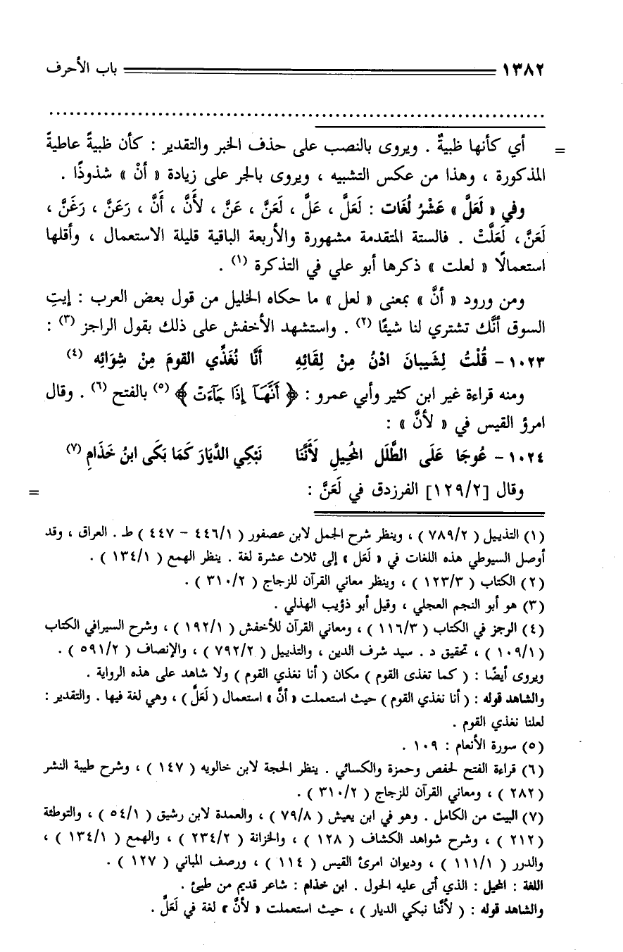 (¬1) التذييل (2/ 789)، وينظر شرح الجمل لابن عصفور (1/ 446 - 447) ط. العراق، وقد أوصل السيوطي هذه اللغات في «لعل» إلى ثلاث عشرة لغة. ينظر الهمع (1/ 134).