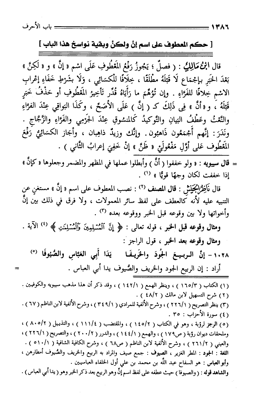 قال ابن مالك: (فصل؛ يجوز رفع المعطوف على اسم «إنّ» و «لكنّ» بعد الخبر بإجماع لا قبله مطلقا، خلافا للكسائي، ولا بشرط خفاء إعراب الاسم خلافا للفرّاء. وإن توهّم ما رأياه قدّر تأخير المعطوف أو حذف خبر قبله، و «أنّ» في ذلك كـ (إنّ) على الأصحّ، وكذا البواقي عند الفرّاء والنّعت وعطف البيان والتّوكيد كالمنسوق عند الجرمي والفرّاء والزّجّاج.