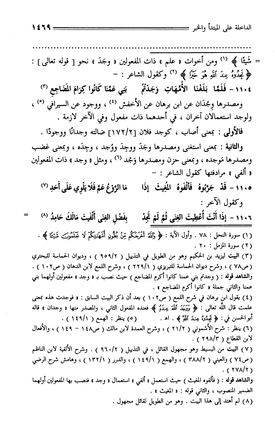 (¬4) يقول ابن برهان في شرح اللمع (ص 102) بعد أن ذكر البيت السابق: «فوجدت هذه بمعنى علمت قال الله تعالى: وَوَجَدَ اللَّهَ عِنْدَهُ فعنده المفعول الثاني، والمصدر منها «وجدان» قاله أبو الحسن في: تَجِدُوهُ عِنْدَ اللَّهِ. اه.