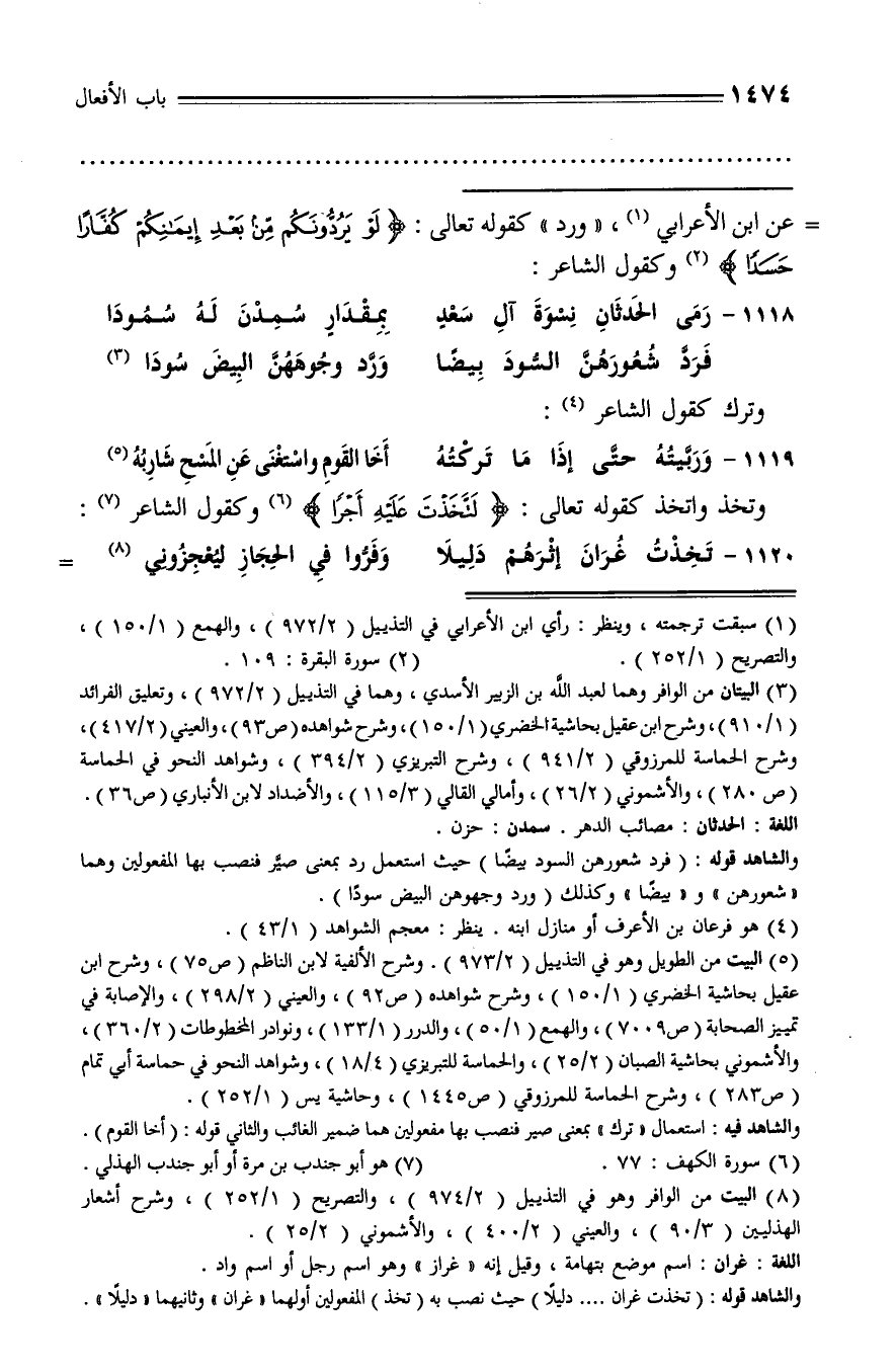 (¬8) البيت من الوافر وهو في التذييل (2/ 974)، والتصريح (1/ 252)، وشرح أشعار الهذليين (3/ 90)، والعيني (2/ 400)، والأشموني (2/ 25).