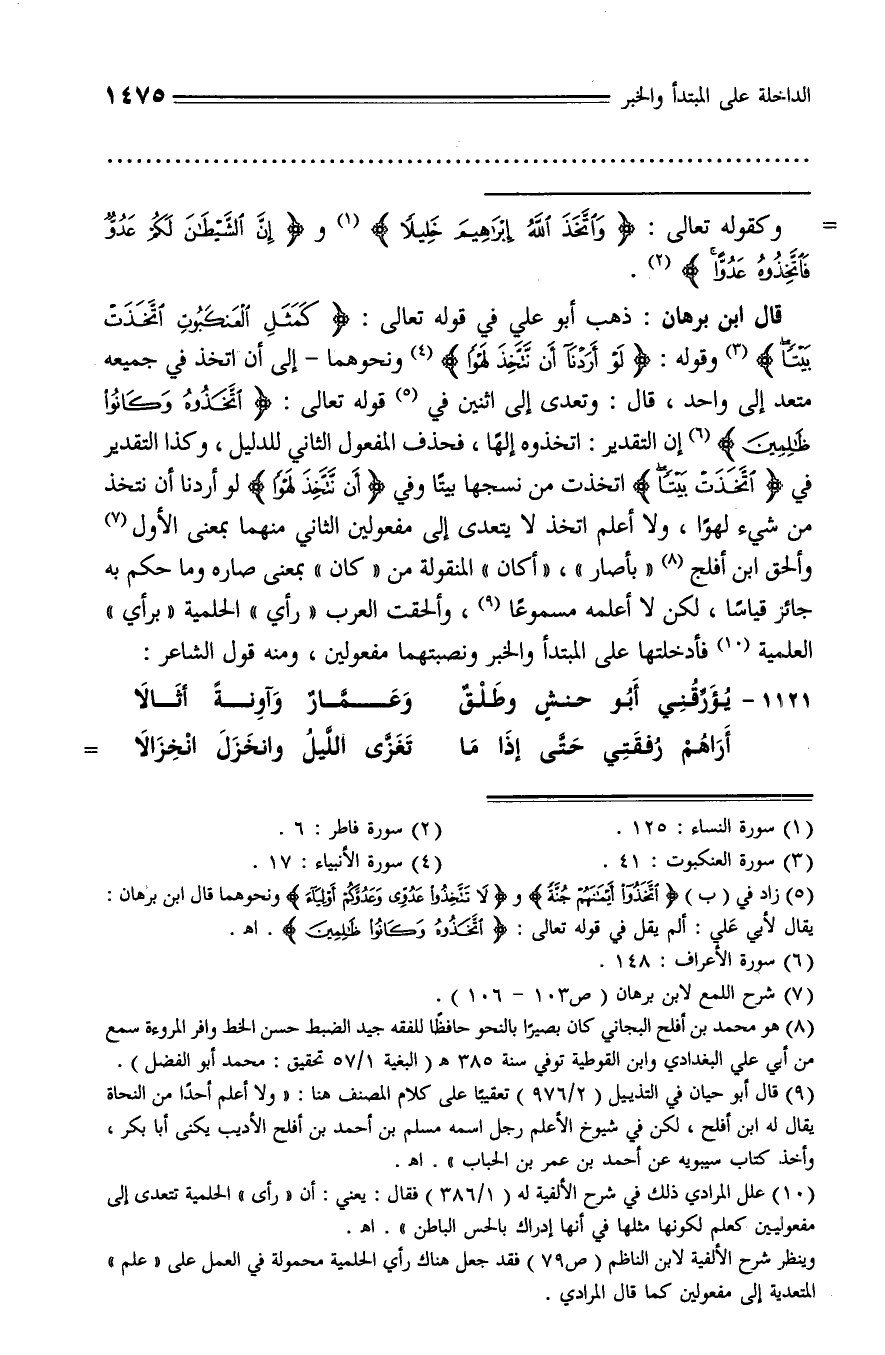 قال ابن برهان: ذهب أبو علي في قوله تعالى: كَمَثَلِ الْعَنْكَبُوتِ اتَّخَذَتْ بَيْتاً (¬3) وقوله: لَوْ أَرَدْنا أَنْ نَتَّخِذَ لَهْواً (¬4) ونحوهما - إلى أن اتخذ في جميعه متعد إلى واحد، قال: وتعدى إلى اثنين في (¬5) قوله تعالى: اتَّخَذُوهُ وَكانُوا ظالِمِينَ (¬6) إن التقدير: اتخذوه إلها، فحذف المفعول الثاني للدليل، وكذا التقدير في اتَّخَذَتْ بَيْتاً اتخذت من نسجها بيتا وفي أَنْ نَتَّخِذَ لَهْواً لو أردنا أن نتخذ من شيء لهوا، ولا أعلم اتخذ لا يتعدى إلى مفعولين الثاني منهما بمعنى الأول (¬7) وألحق ابن أفلج (¬8) «بأصار»، «أكان» المنقولة من «كان» بمعنى صاره وما حكم به جائز قياسا، لكن لا أعلمه مسموعا (¬9)، وألحقت العرب «رأي» الحلمية «برأي» العلمية (¬10) فأدخلتها على المبتدأ والخبر ونصبتهما مفعولين، ومنه قول الشاعر: