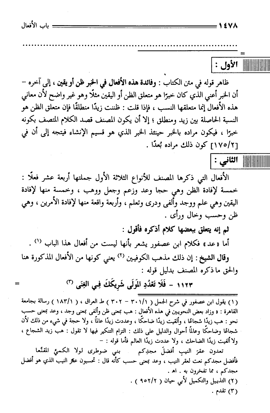 (¬1) يقول ابن عصفور في شرح الجمل (1/ 301 - 302) ط العراق، (1/ 183) رسالة بجامعة القاهرة: «وزاد بعض النحويين في هذه الأفعال: هب بمعنى ظن وألفى بمعنى وجد، وعد بمعنى حسب نحو: هب زيدا شجاعا، وألقيت زيدا ضاحكا، وعددت زيدا عالما، ولا حجة في شيء من ذلك لأن شجاعا وضاحكا وعالما أحوال والدليل على ذلك: التزام التنكير فيها لا تقول: هب زيد الشجاع، ولا ألفيت زيدا الضاحك، ولا عددت زيدا العالم فأما قوله: -