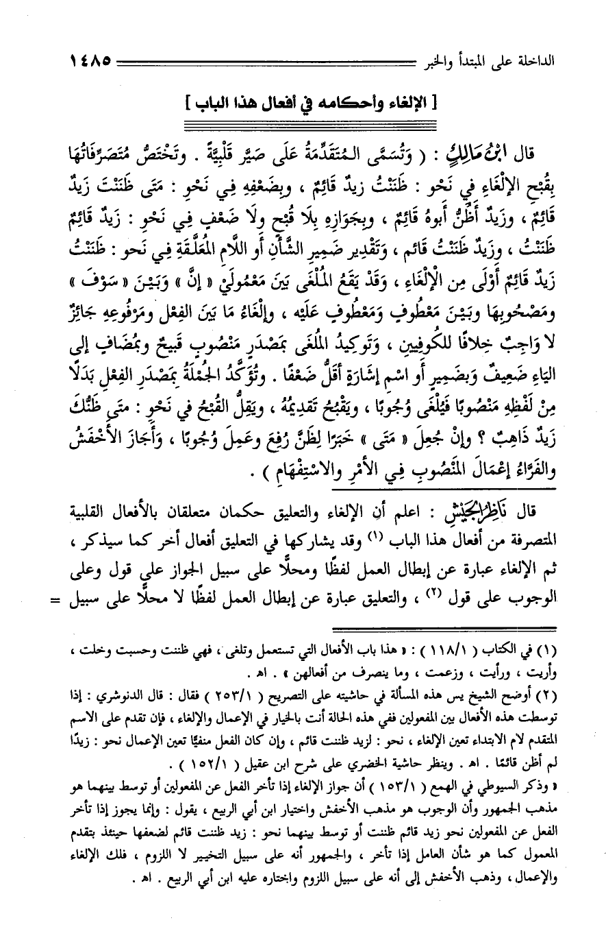 «وذكر السيوطي في الهمع (1/ 153) أن جواز الإلغاء إذا تأخر الفعل عن المفعولين أو توسط بينهما هو مذهب الجمهور وأن الوجوب هو مذهب الأخفش واختيار ابن أبي الربيع، يقول: وإنما يجوز إذا تأخر الفعل عن المفعولين نحو زيد قائم ظننت أو توسط بينهما نحو: زيد ظننت قائم لضعفها حينئذ بتقدم المعمول كما هو شأن العامل إذا تأخر، والجمهور أنه على سبيل التخيير لا اللزوم، فلك الإلغاء والإعمال، وذهب الأخفش إلى أنه على سبيل اللزوم واختاره عليه ابن أبي الربيع. اه.