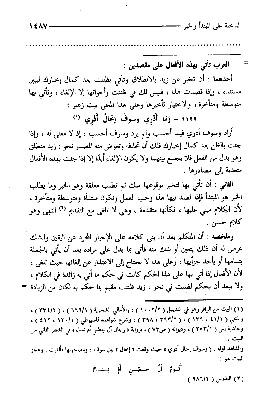 وملخصه: أن المتكلم بعد أن بنى كلامه على الإخبار المجرد عن اليقين والشك عرض له أن ذلك يتعين أو شك منه فأتى بما يدل على مراده بعد أن يأتي بالجملة بتمامها أو بأحد جزأيها، وعلى هذا لا يحتاج إلى الاعتذار عن إلغائها حيث تلغى، لأن الأفعال إذا أتي بها على هذا الحكم كانت في حكم ما أتي به زائدة في الكلام، ولا يبعد أن يحكم لظننت في نحو: زيد ظننت مقيم بما حكم به لكان من الزيادة -