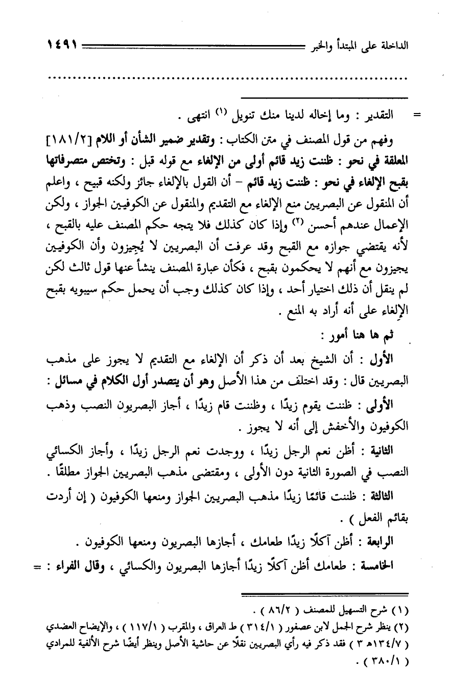 وفهم من قول المصنف في متن الكتاب: وتقدير ضمير الشأن أو اللام [2/ 181] المعلقة في نحو: ظننت زيد قائم أولى من الإلغاء مع قوله قبل: وتختص متصرفاتها بقبح الإلغاء في نحو: ظننت زيد قائم - أن القول بالإلغاء جائز
