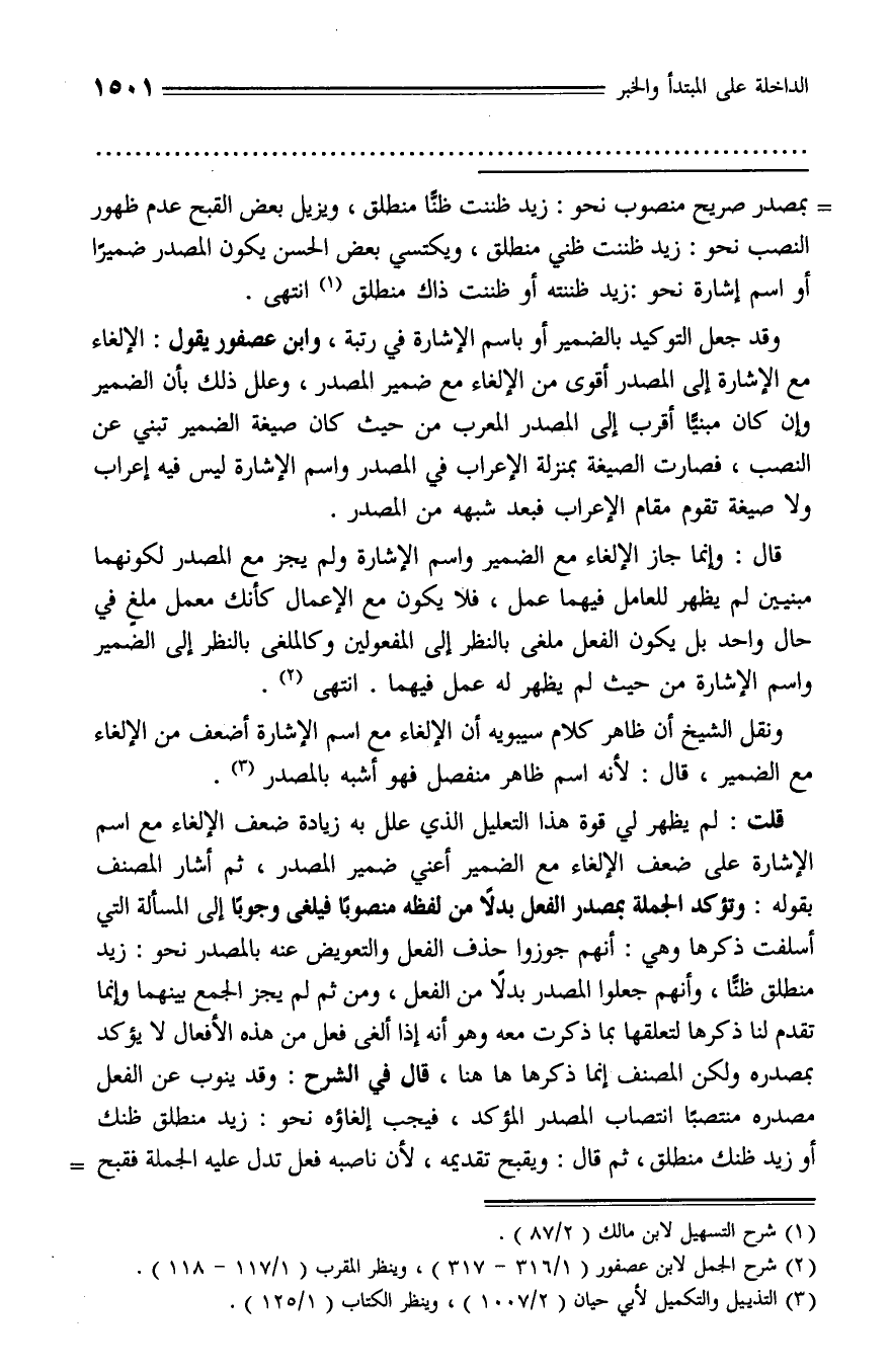 قال: وإنما جاز الإلغاء مع الضمير واسم الإشارة ولم يجز مع المصدر لكونهما مبنيين لم يظهر للعامل فيهما عمل، فلا يكون مع الإعمال كأنك معمل ملغ في حال واحد بل يكون الفعل ملغى بالنظر إلى المفعولين وكالملغى بالنظر إلى الضمير واسم الإشارة من حيث لم يظهر له عمل فيهما. انتهى (¬2).