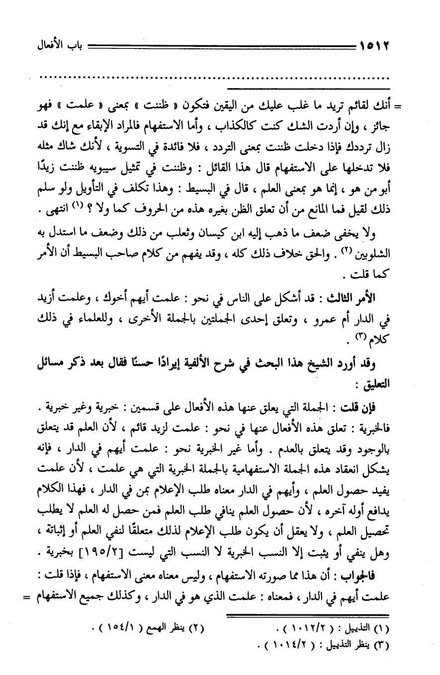 الأمر الثالث: قد أشكل على الناس في نحو: علمت أيهم أخوك، وعلمت أزيد في الدار أم عمرو، وتعلق إحدى الجملتين بالجملة الأخرى، وللعلماء في ذلك كلام (¬3).