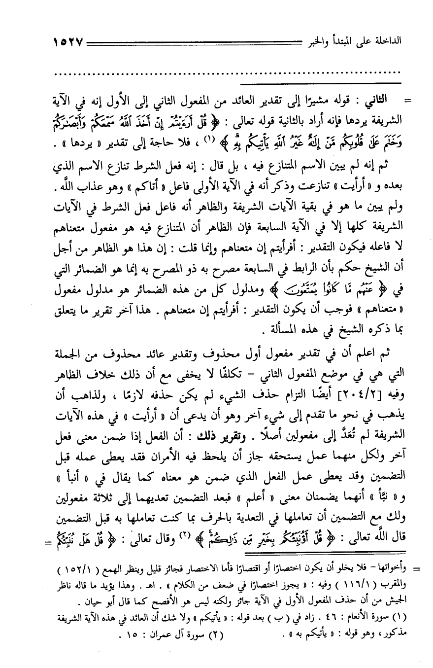 الثاني: قوله مشيرا إلى تقدير العائد من المفعول الثاني إلى الأول إنه في الآية الشريفة يردها فإنه أراد بالثانية قوله تعالى: قُلْ أَرَأَيْتُمْ إِنْ أَخَذَ اللَّهُ سَمْعَكُمْ وَأَبْصارَكُمْ وَخَتَمَ عَلى قُلُوبِكُمْ مَنْ إِلهٌ غَيْرُ اللَّهِ يَأْتِيكُمْ بِهِ (¬1)، فلا حاجة إلى تقدير «يردها».