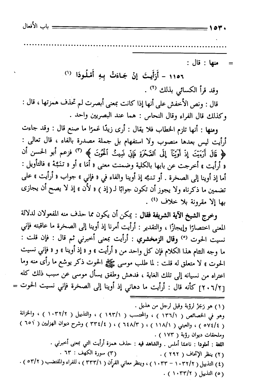 قالَ أَرَأَيْتَ إِذْ أَوَيْنا إِلَى الصَّخْرَةِ فَإِنِّي نَسِيتُ الْحُوتَ (¬3) فزعم أبو الحسن أن «أرأيت» أخرجت عن بابها بالكلية وضمنت معنى «أما» أو «تنبّه» فالتأويل: