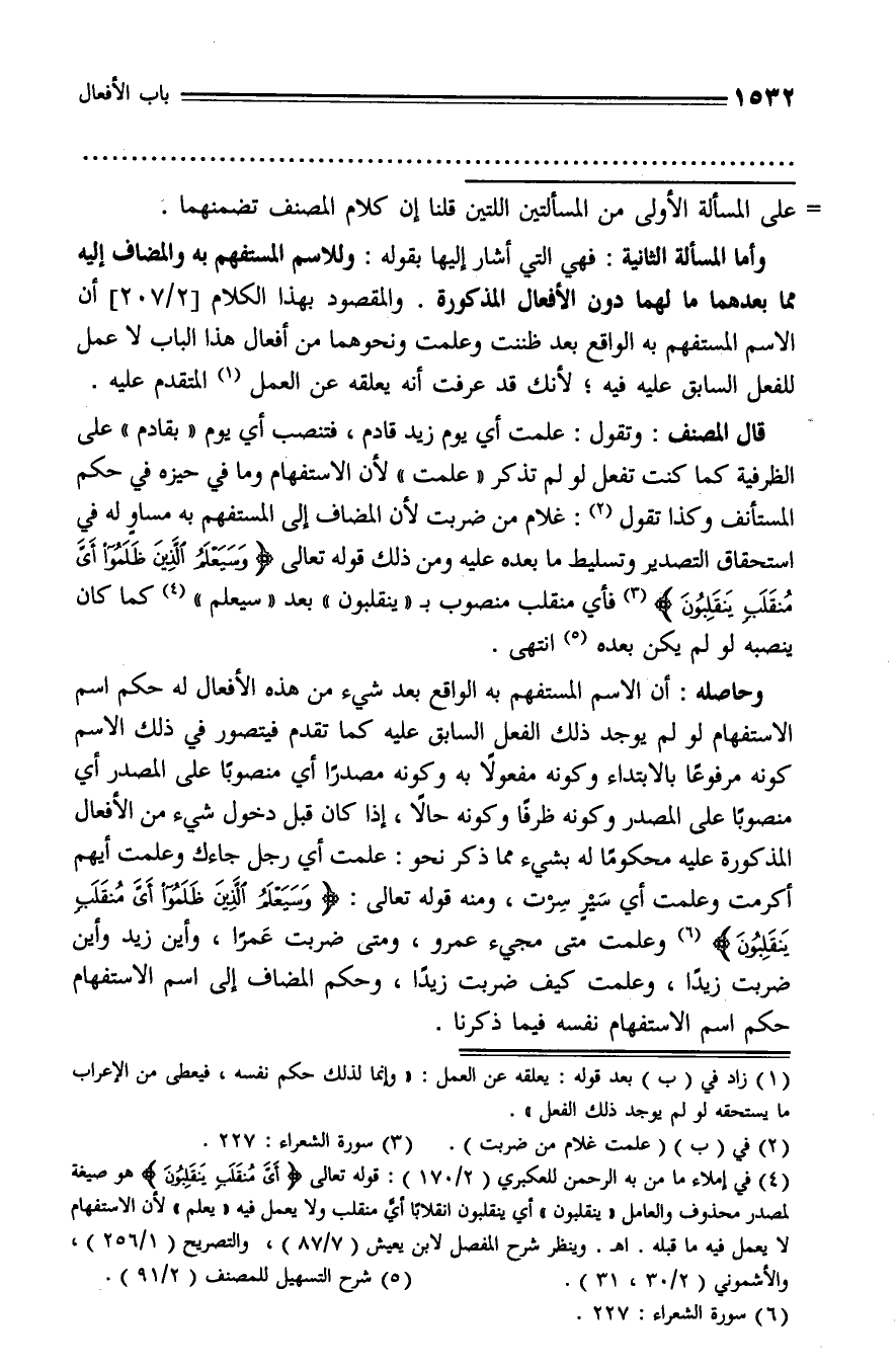 وأما المسألة الثانية: فهي التي أشار إليها بقوله: وللاسم المستفهم به والمضاف إليه مما بعدهما ما لهما دون الأفعال المذكورة. والمقصود بهذا الكلام [2/ 207] أن الاسم المستفهم به الواقع بعد ظننت وعلمت ونحوهما من أفعال هذا الباب لا عمل للفعل السابق عليه فيه؛ لأنك قد عرفت أنه يعلقه عن العمل (¬1) المتقدم عليه.