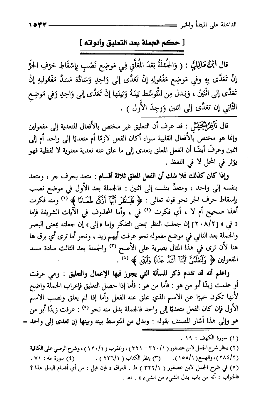 وإذا كان كذلك فلا شك أن الفعل المعلق ثلاثة أقسام: متعد بحرف جر، ومتعد بنفسه إلى واحد، ومتعدّ بنفسه إلى اثنين: فالجملة بعد الأول في موضع نصب بإسقاط حرف الجر نحو قوله تعالى: فَلْيَنْظُرْ أَيُّها أَزْكى طَعاماً (¬1) ومنه فكرت أهذا صحيح أم لا، أي فكرت (¬2) في، وأما المحذوف في الآيات الشريفة فإما «في» [2/ 208] إن جعلت النظر بمعنى التفكر وإما «إلى» إن جعلته بمعنى البصر والجملة بعد الثاني في موضع مفعوله نحو عرفت أيهم زيد، ونحو أما ترى أي برق ها هنا لأن ترى في هذا المثال بصرية على الأصح (¬3) والجملة بعد الثالث سادة مسد المفعولين وَلَتَعْلَمُنَّ أَيُّنا أَشَدُّ عَذاباً وَأَبْقى (¬4).