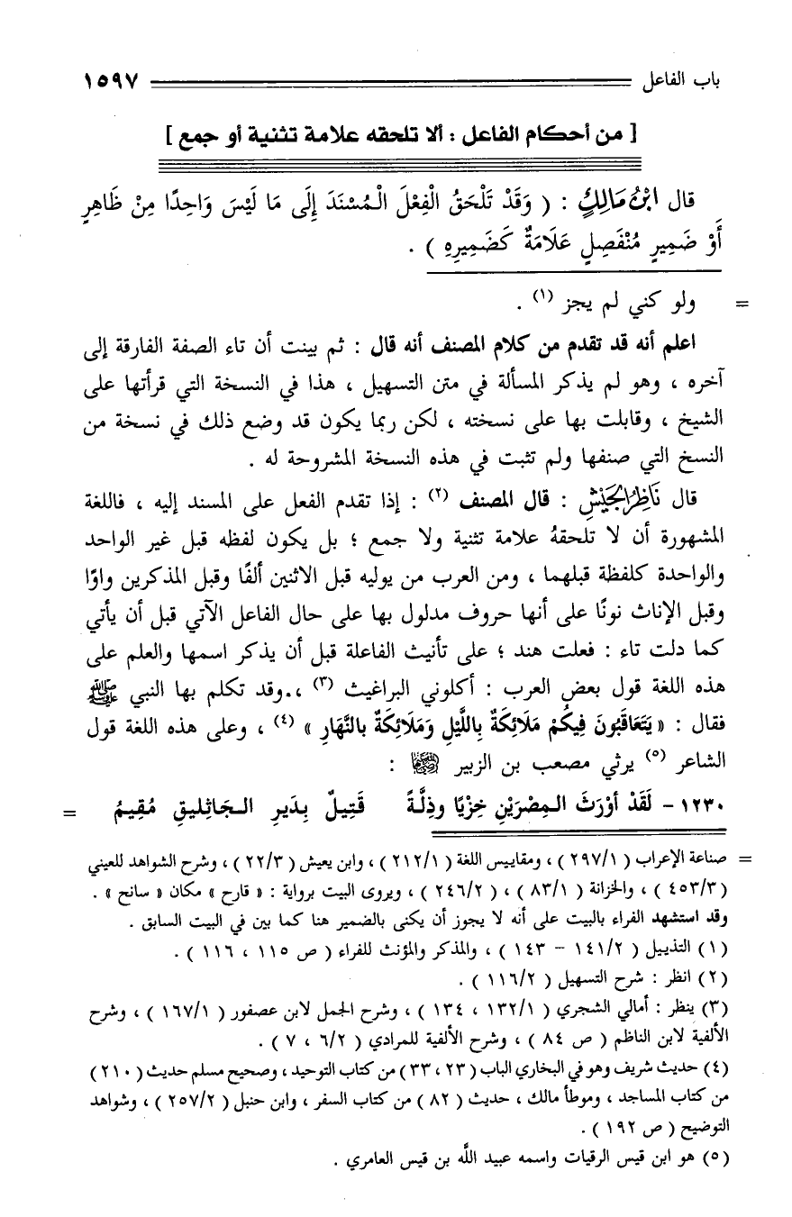 قال ناظر الجيش: قال المصنف (¬2): إذا تقدم الفعل على المسند إليه، فاللغة المشهورة أن لا تلحقه علامة تثنية ولا جمع؛ بل يكون لفظه قبل غير الواحد والواحدة كلفظة قبلهما، ومن العرب من يوليه قبل الاثنين ألفا وقبل المذكرين واوا وقبل الإناث نونا على أنها حروف مدلول بها على حال الفاعل الآتي قبل أن يأتي كما دلت تاء: فعلت هند؛ على تأنيث الفاعلة قبل أن يذكر اسمها والعلم على هذه اللغة قول بعض العرب: أكلوني البراغيث (¬3)، وقد تكلم بها النبي صلّى الله عليه وسلّم فقال: «يتعاقبون فيكم ملائكة باللّيل وملائكة بالنّهار» (¬4)، وعلى هذه اللغة قول الشاعر (¬5) يرثي مصعب بن الزبير رضي الله عنهما: