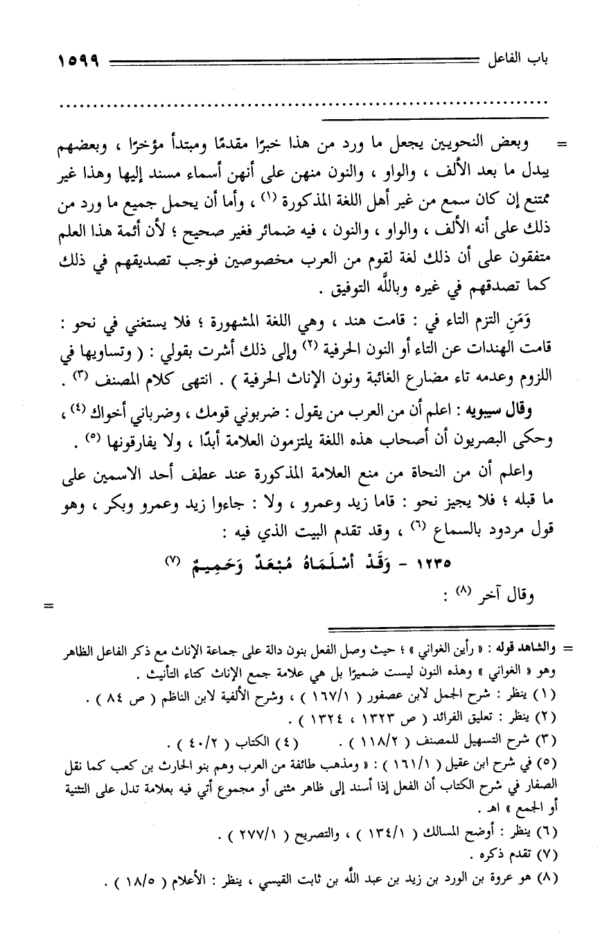 (¬5) في شرح ابن عقيل (1/ 161): «ومذهب طائفة من العرب وهم بنو الحارث بن كعب كما نقل الصفار في شرح الكتاب أن الفعل إذا أسند إلى ظاهر مثنى أو مجموع أتي فيه بعلامة تدل على التثنية أو الجمع» اه.