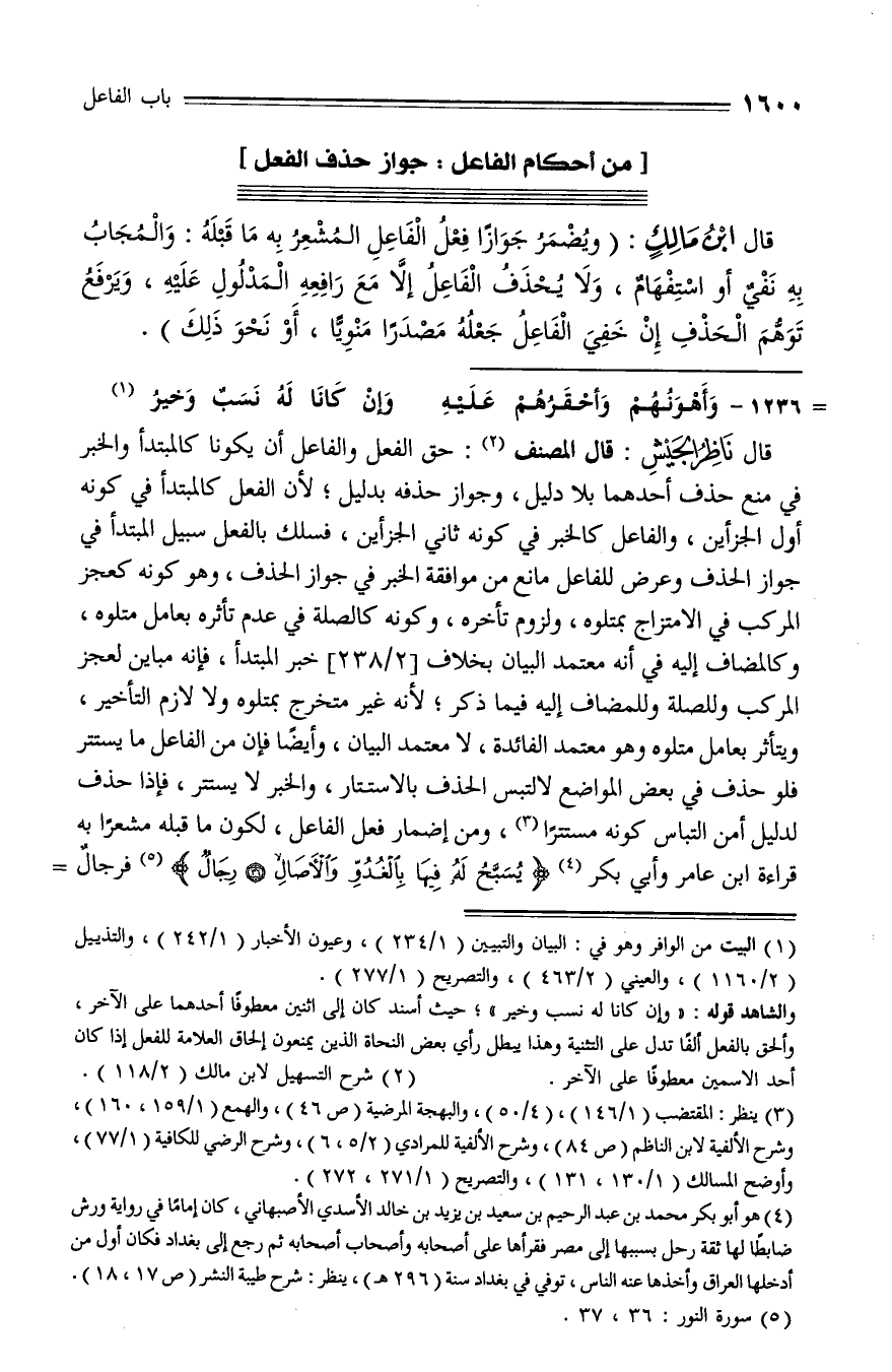 قال ناظر الجيش: قال المصنف (¬2): حق الفعل والفاعل أن يكونا كالمبتدأ والخبر في منع حذف أحدهما بلا دليل، وجواز حذفه بدليل؛ لأن الفعل كالمبتدأ في كونه أول الجزأين، والفاعل كالخبر في كونه ثاني الجزأين، فسلك بالفعل سبيل المبتدأ في جواز الحذف وعرض للفاعل مانع من موافقة الخبر في جواز الحذف، وهو كونه كعجز المركب في الامتزاج بمتلوه، ولزوم تأخره، وكونه كالصلة في عدم تأثره بعامل متلوه، وكالمضاف إليه في أنه معتمد البيان بخلاف [2/ 238] خبر المبتدأ، فإنه مباين لعجز المركب وللصلة وللمضاف إليه فيما ذكر؛ لأنه غير متخرج بمتلوه ولا لازم التأخير، ويتأثر بعامل متلوه وهو معتمد الفائدة، لا معتمد البيان، وأيضا فإن من الفاعل ما يستتر فلو حذف في بعض المواضع لالتبس الحذف بالاستتار، والخبر لا يستتر، فإذا حذف لدليل أمن التباس كونه مستترا (¬3)، ومن إضمار فعل الفاعل، لكون ما قبله مشعرا به قراءة ابن عامر وأبي بكر (¬4) يسبح له فيها بالغدو والآصال (36) رجال (¬5) فرجال -