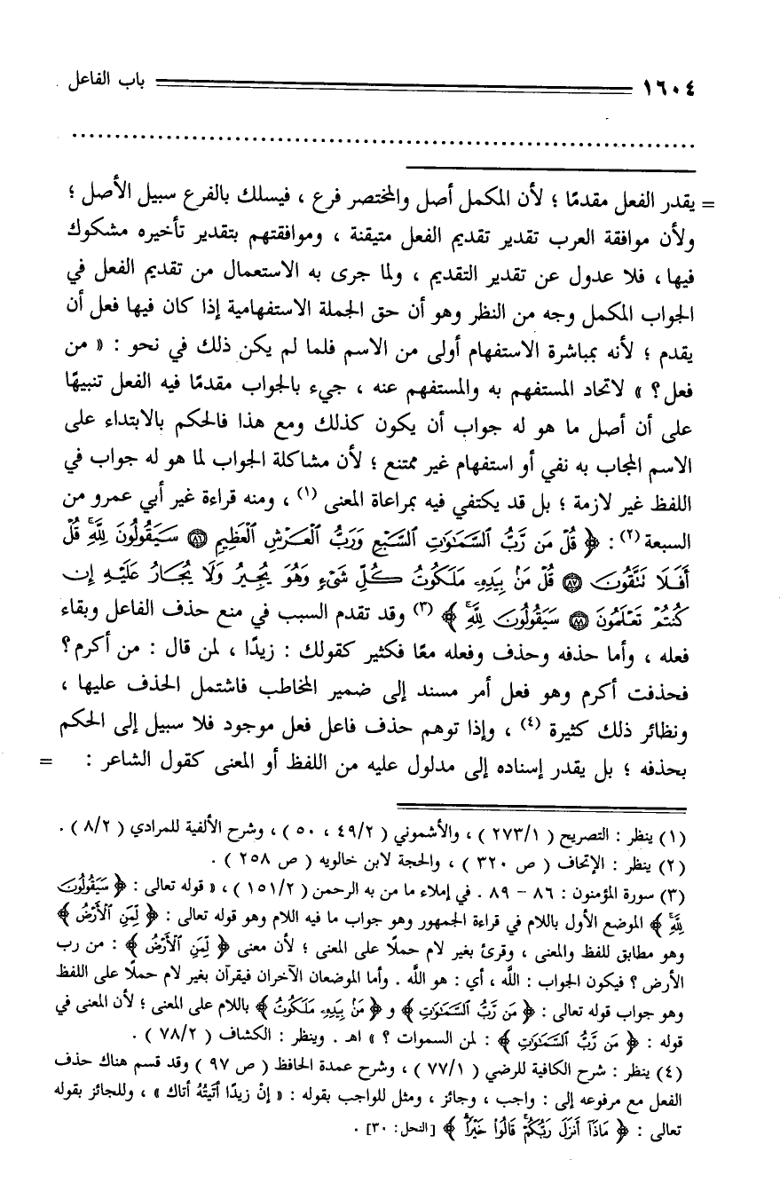 (¬4) ينظر: شرح الكافية للرضي (1/ 77)، وشرح عمدة الحافظ (ص 97) وقد قسم هناك حذف الفعل مع مرفوعه إلى: واجب، وجائز، ومثل للواجب بقوله: «إن زيدا أتيته أتاك»، وللجائز بقوله تعالى: ماذا أَنْزَلَ رَبُّكُمْ قالُوا خَيْراً [النحل: 30].