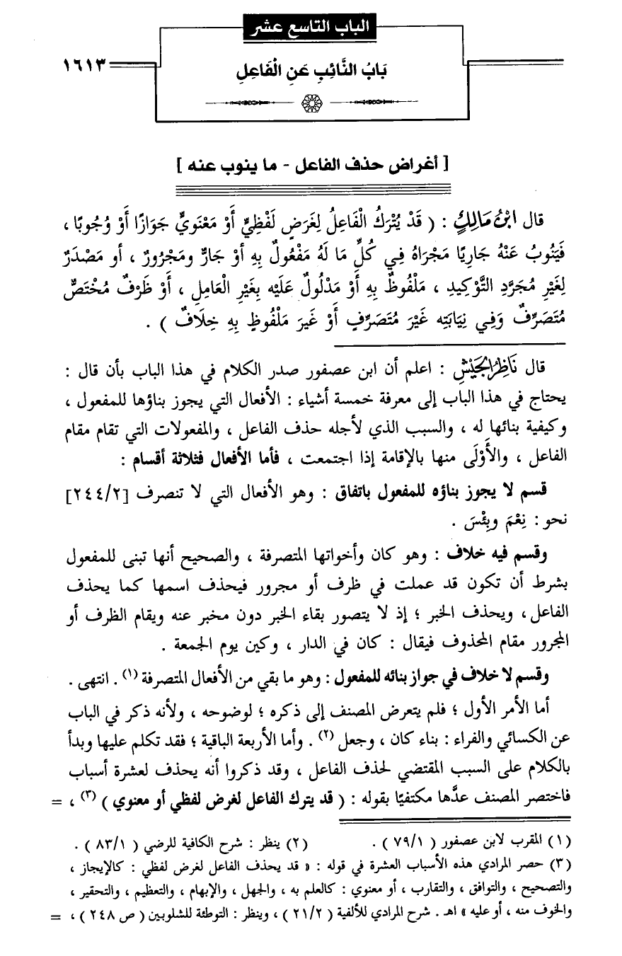 (¬3) حصر المرادي هذه الأسباب العشرة في قوله: «قد يحذف الفاعل لغرض لفظي: كالإيجاز، والتصحيح، والتوافق، والتقارب، أو معنوي: كالعلم به، والجهل، والإبهام، والتعظيم، والتحقير، والخوف منه، أو عليه» اه. شرح المرادي للألفية (2/ 21)، وينظر: التوطئة للشلوبين (ص 248)، -