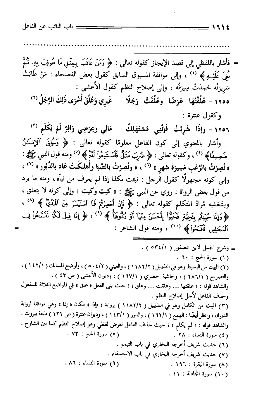 والشاهد قوله: «لم يكلم»؛ حيث حذف الفاعل لغرض لفظي وهو إصلاح النظم كما بين الشارح.