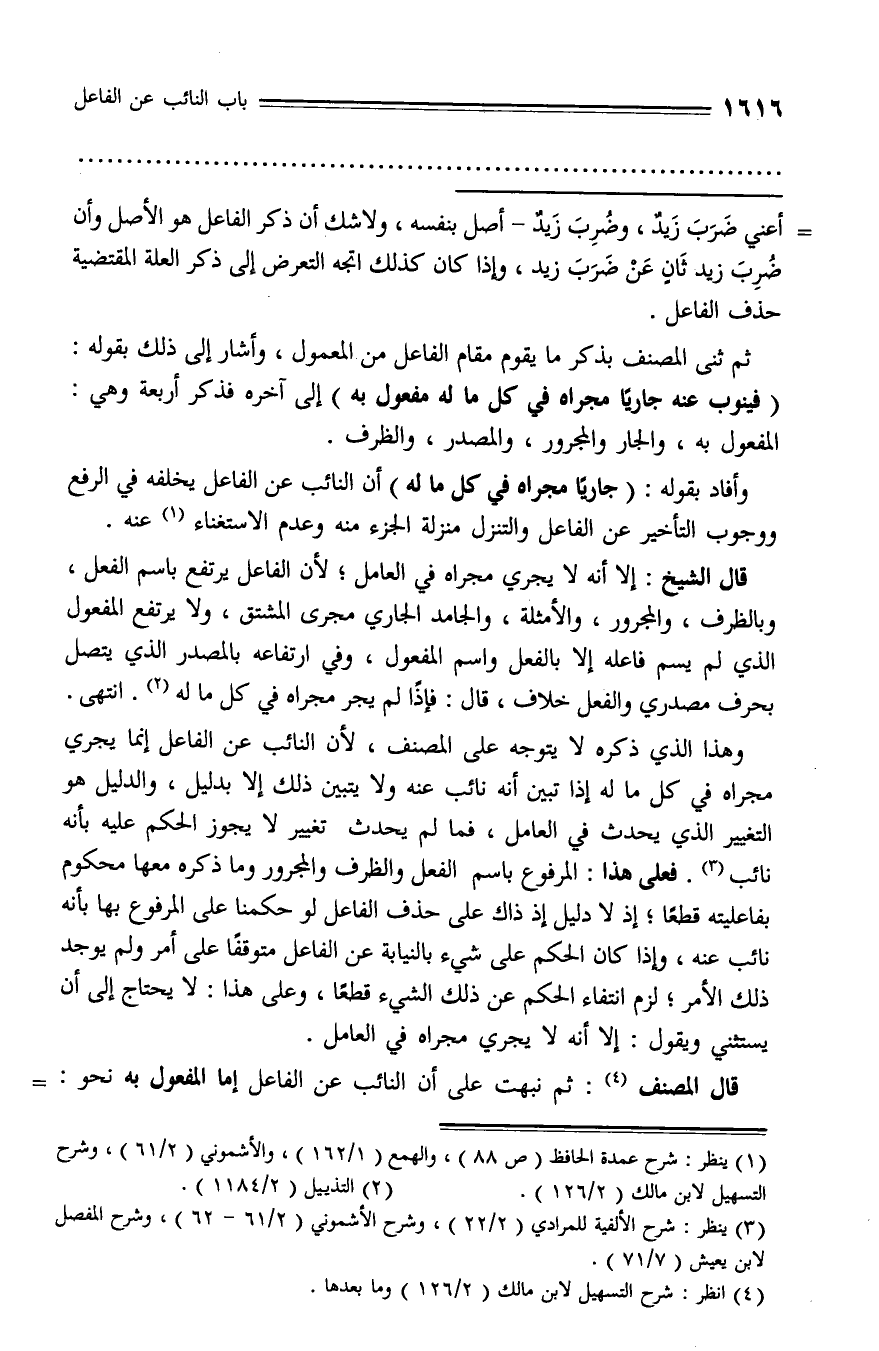 وهذا الذي ذكره لا يتوجه على المصنف، لأن النائب عن الفاعل إنما يجري مجراه في كل ما له إذا تبين أنه نائب عنه ولا يتبين ذلك إلا بدليل، والدليل هو التغيير الذي يحدث في العامل، فما لم يحدث تغيير لا يجوز الحكم عليه بأنه نائب (¬3). فعلى هذا: المرفوع باسم الفعل والظرف والمجرور وما ذكره معها محكوم بفاعليته قطعا؛ إذ لا دليل إذ ذاك على حذف الفاعل لو حكمنا على المرفوع بها بأنه نائب عنه، وإذا كان الحكم على شيء بالنيابة عن الفاعل متوقفا على أمر ولم يوجد ذلك الأمر؛ لزم انتفاء الحكم عن ذلك الشيء قطعا، وعلى هذا: لا يحتاج إلى أن يستثني ويقول: إلا أنه لا يجري مجراه في العامل.