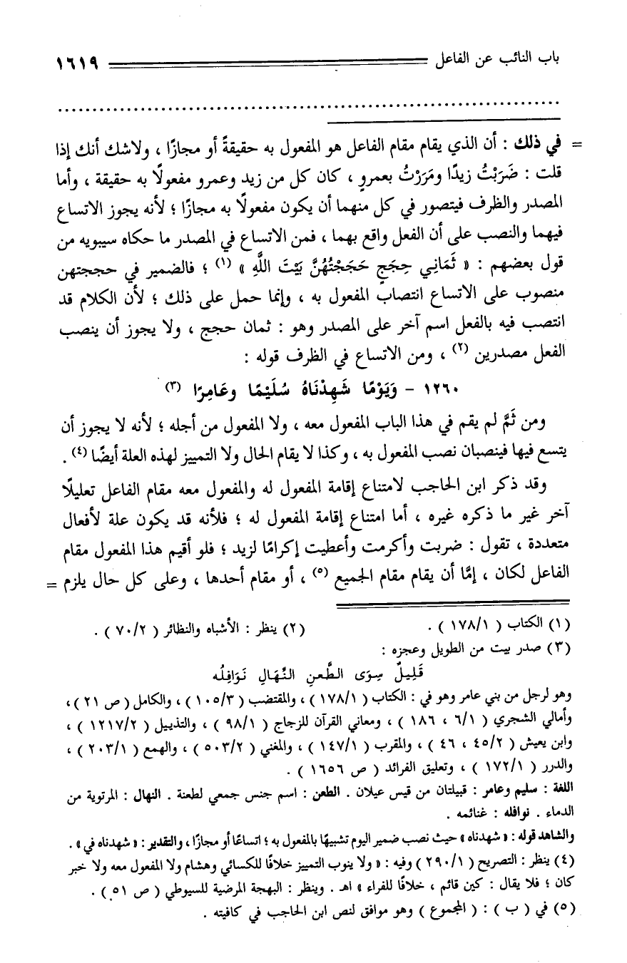 وقد ذكر ابن الحاجب لامتناع إقامة المفعول له والمفعول معه مقام الفاعل تعليلا آخر غير ما ذكره غيره، أما امتناع إقامة المفعول له؛ فلأنه قد يكون علة لأفعال متعددة، تقول: ضربت وأكرمت وأعطيت إكراما لزيد؛ فلو أقيم هذا المفعول مقام الفاعل لكان، إمّا أن يقام مقام الجميع (¬5)، أو مقام أحدها، وعلى كل حال يلزم -