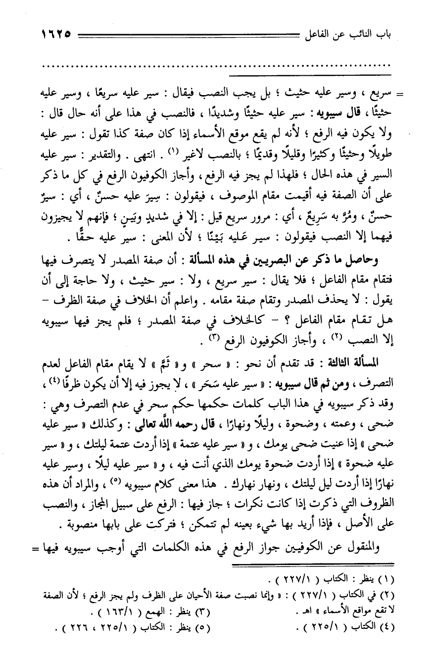 وحاصل ما ذكر عن البصريين في هذه المسألة: أن صفة المصدر لا يتصرف فيها فتقام مقام الفاعل؛ فلا يقال: سير سريع، ولا: سير حثيث، ولا حاجة إلى أن يقول: لا يحذف المصدر وتقام صفة مقامه. واعلم أن الخلاف في صفة الظرف - هل تقام مقام الفاعل؟ - كالخلاف في صفة المصدر؛ فلم يجز فيها سيبويه إلا النصب (¬2)، وأجاز الكوفيون الرفع (¬3).