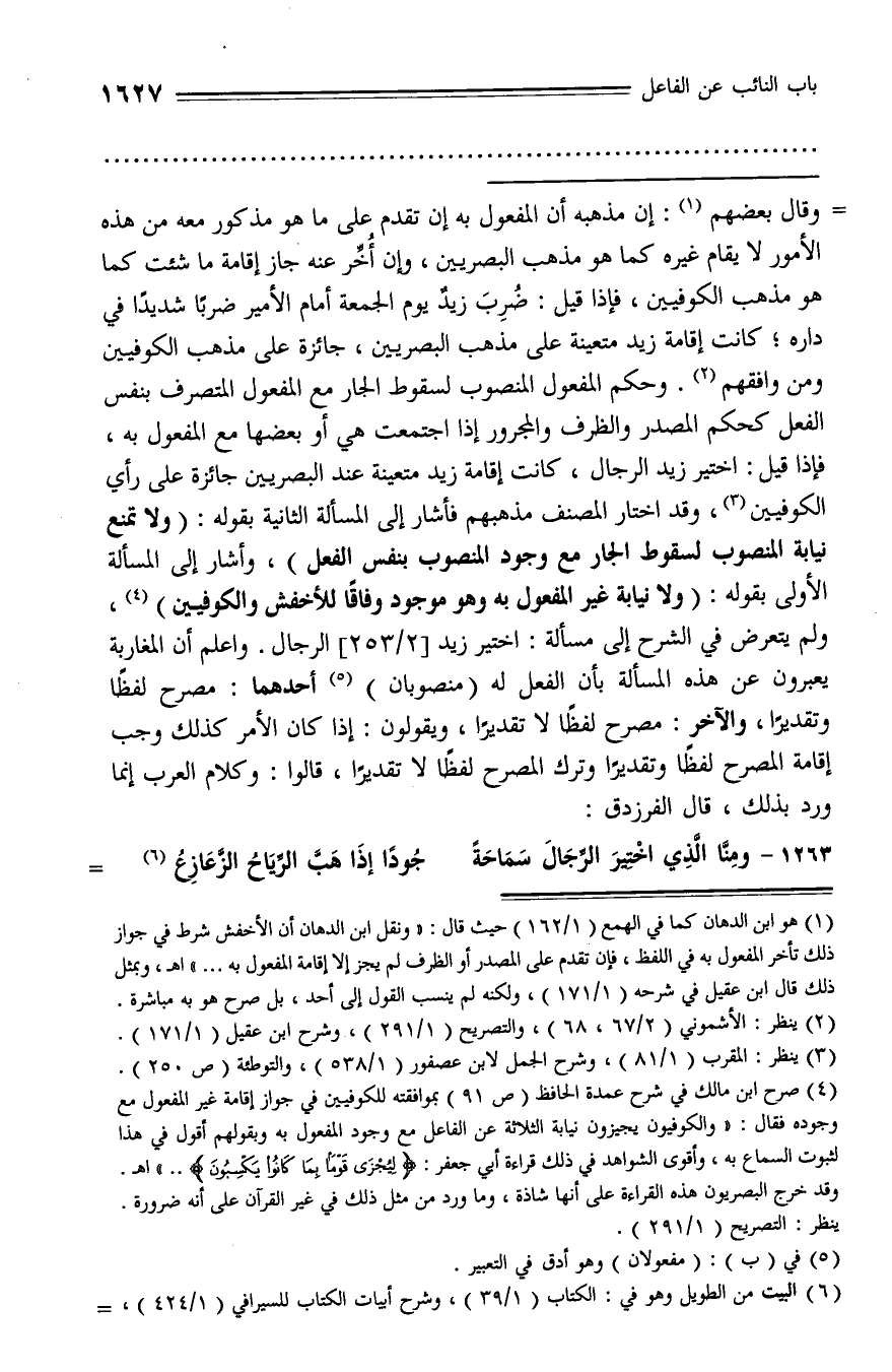 (¬4) صرح ابن مالك في شرح عمدة الحافظ (ص 91) بموافقته للكوفيين في جواز إقامة غير المفعول مع وجوده فقال: «والكوفيون يجيزون نيابة الثلاثة عن الفاعل مع وجود المفعول به وبقولهم أقول في هذا لثبوت السماع به، وأقوى الشواهد في ذلك قراءة أبي جعفر: ليجزى قوما بما كانوا يكسبون ..» اه.