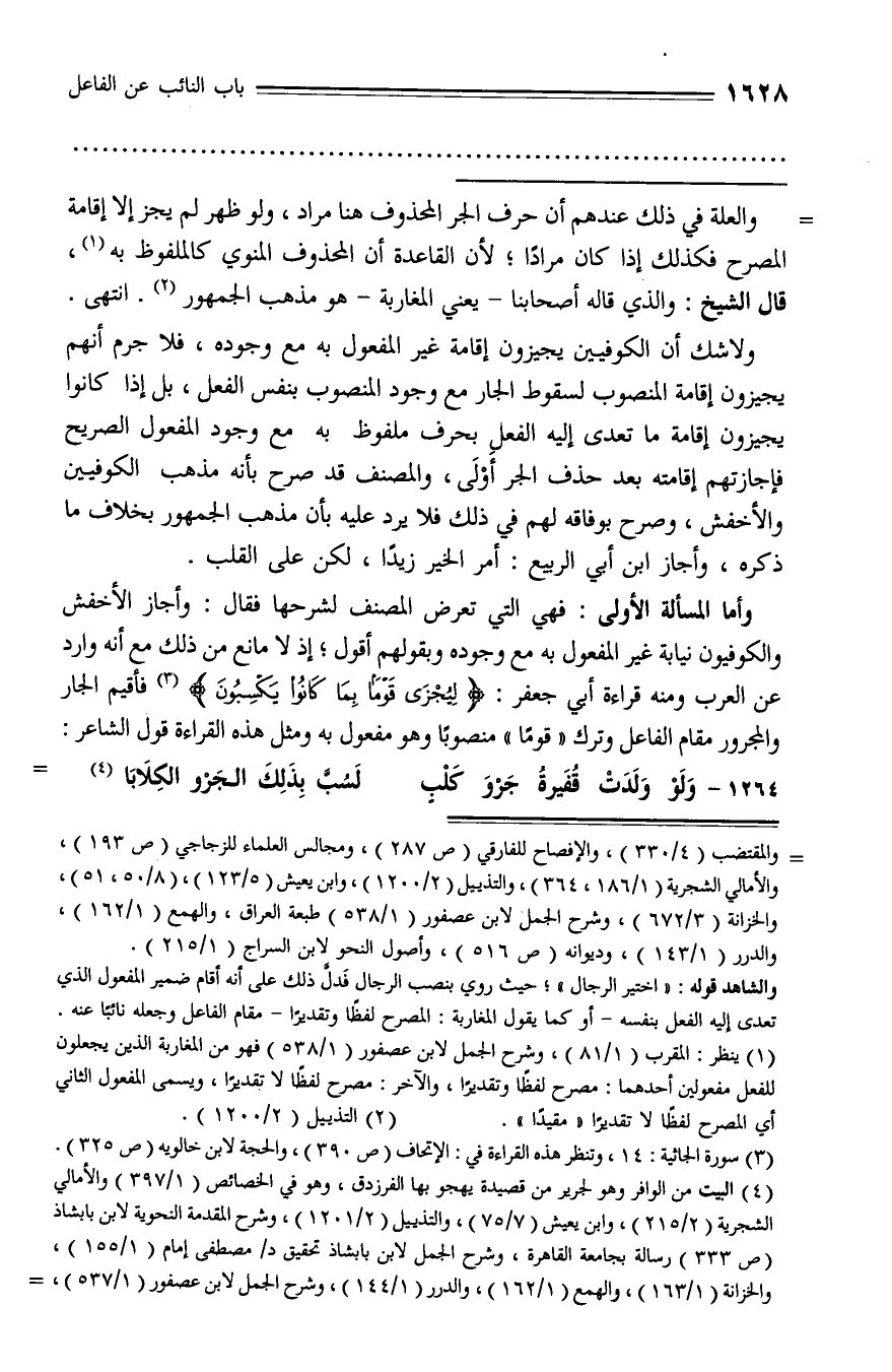 والعلة في ذلك عندهم أن حرف الجر المحذوف هنا مراد، ولو ظهر لم يجز إلا إقامة المصرح فكذلك إذا كان مرادا؛ لأن القاعدة أن المحذوف المنوي كالملفوظ به (¬1)، قال الشيخ: والذي قاله أصحابنا - يعني المغاربة - هو مذهب الجمهور (¬2). انتهى.