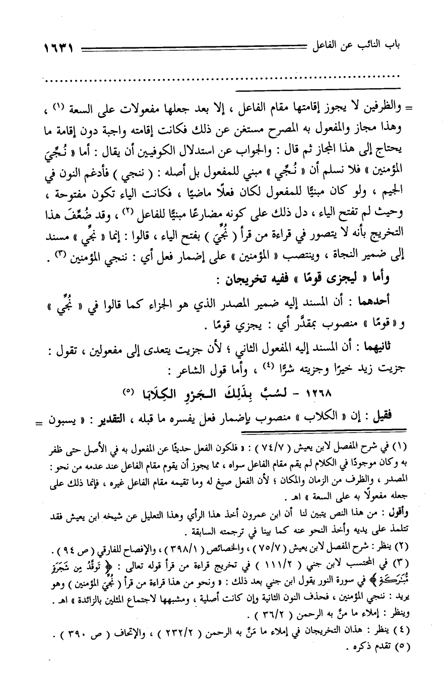والظرفين لا يجوز إقامتها مقام الفاعل، إلا بعد جعلها مفعولات على السعة (¬1)، وهذا مجاز والمفعول به المصرح مستغن عن ذلك فكانت إقامته واجبة دون إقامة ما يحتاج إلى هذا المجاز ثم قال: والجواب عن استدلال الكوفيين أن يقال: أما «نجّي المؤمنين» فلا نسلم أن «نجّي» مبني للمفعول بل أصله: (ننجي) فأدغم النون في الجيم، ولو كان مبنيّا للمفعول لكان فعلا ماضيا، فكانت الياء تكون مفتوحة، وحيث لم تفتح الياء، دل ذلك على كونه مضارعا مبنيّا للفاعل (¬2)، وقد ضعّف هذا التخريج بأنه لا يتصور في قراءة من قرأ (نجّي) بفتح الياء، قالوا: إنما «نجّي» مسند إلى ضمير النجاة، وينتصب «المؤمنين» على إضمار فعل أي: ننجي المؤمنين (¬3).