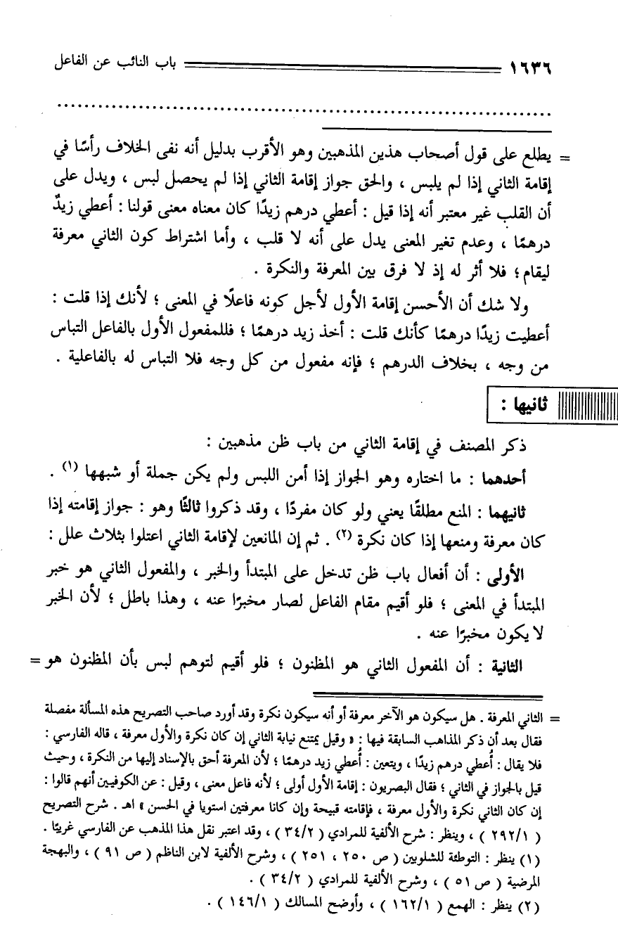 ثانيهما: المنع مطلقا يعني ولو كان مفردا، وقد ذكروا ثالثا وهو: جواز إقامته إذا كان معرفة ومنعها إذا كان نكرة (¬2). ثم إن المانعين لإقامة الثاني اعتلوا بثلاث علل: