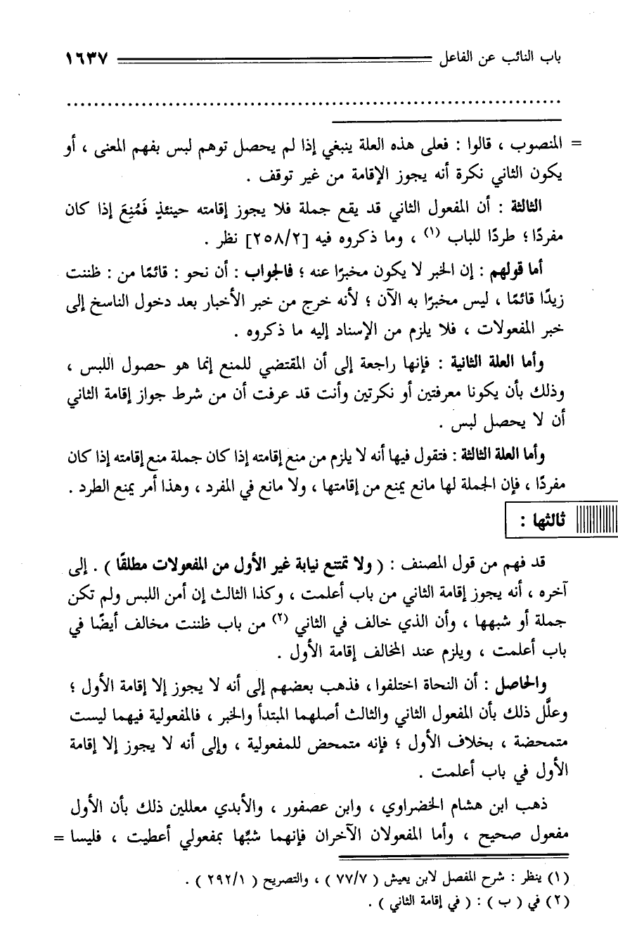 والحاصل: أن النحاة اختلفوا، فذهب بعضهم إلى أنه لا يجوز إلا إقامة الأول؛ وعلّل ذلك بأن المفعول الثاني والثالث أصلهما المبتدأ والخبر، فالمفعولية فيهما ليست متمحضة، بخلاف الأول؛ فإنه متمحض للمفعولية، وإلى أنه لا يجوز إلا إقامة الأول في باب أعلمت.