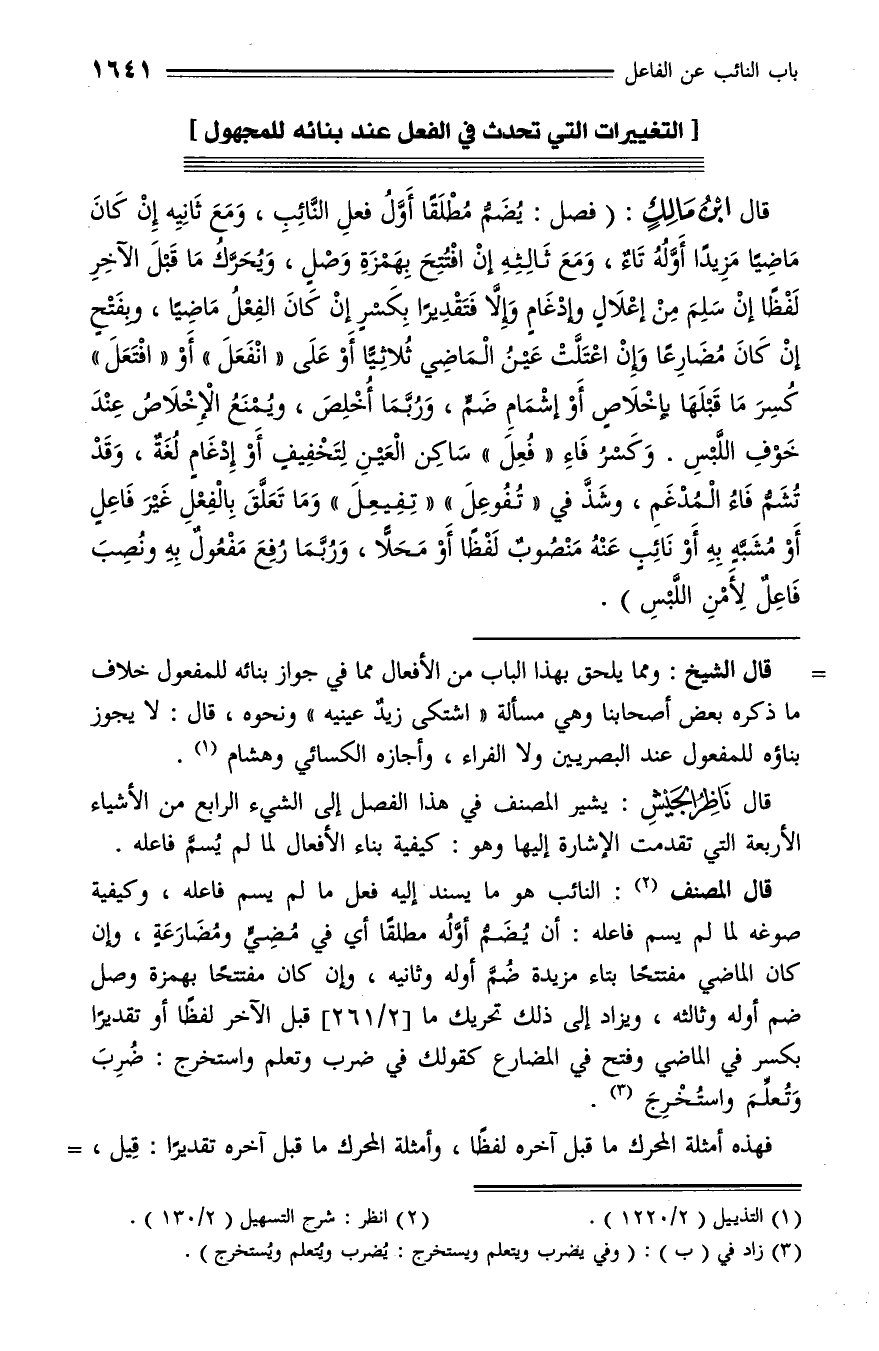 قال ابن مالك: (فصل: يضمّ مطلقا أوّل فعل النّائب، ومع ثانيه إن كان ماضيا مزيدا أوّله تاء، ومع ثالثه إن افتتح بهمزة وصل، ويحرّك ما قبل الآخر لفظا إن سلم من إعلال وإدغام وإلّا فتقديرا بكسر إن كان الفعل ماضيا، وبفتح إن كان مضارعا وإن اعتلّت عين الماضي ثلاثيّا أو على «انفعل» أو «افتعل» كسر ما قبلها بإخلاص أو إشمام ضمّ، وربّما أخلص، ويمنع الإخلاص عند خوف اللّبس. وكسر فاء «فعل» ساكن العين لتخفيف أو إدغام لغة، وقد تشمّ فاء المدغم، وشذّ في «تفوعل» «تفيعل» وما تعلّق بالفعل غير فاعل أو مشبّه به أو نائب عنه منصوب لفظا أو محلّا، وربّما رفع مفعول به ونصب فاعل لأمن اللّبس).