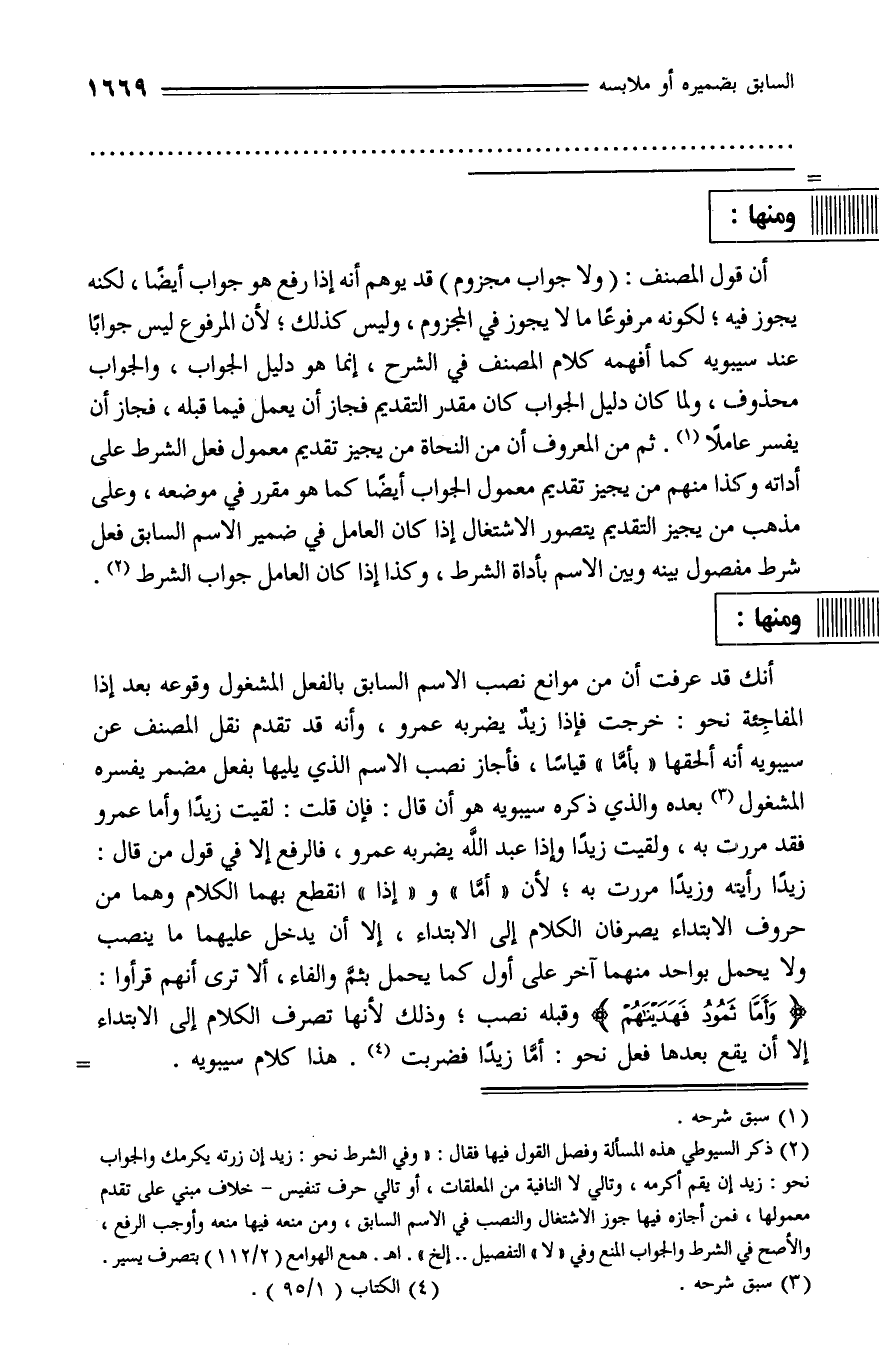 (¬2) ذكر السيوطي هذه المسألة وفصل القول فيها فقال: «وفي الشرط نحو: زيد إن زرته يكرمك والجواب نحو: زيد إن يقم أكرمه، وتالي لا النافية من المعلقات، أو تالي حرف تنفيس - خلاف مبني على تقدم معمولها، فمن أجازه فيها جوز الاشتغال والنصب في الاسم السابق، ومن منعه فيها منعه وأوجب الرفع، والأصح في الشرط والجواب المنع وفي «لا» التفصيل .. إلخ». اه. همع الهوامع (2/ 112) بتصرف يسير.
