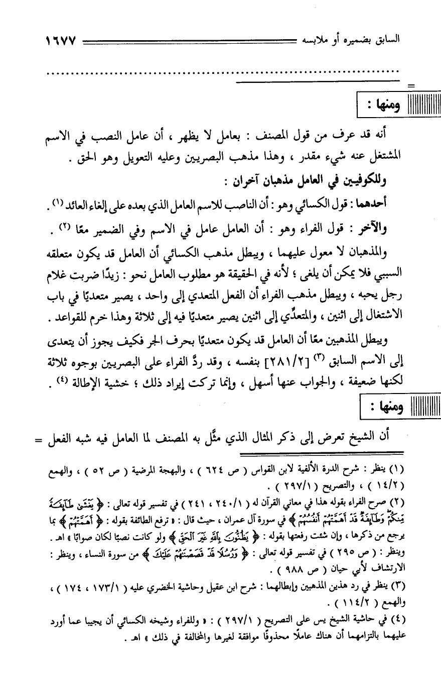 (¬4) في حاشية الشيخ يس على التصريح (1/ 297): «وللفراء وشيخه الكسائي أن يجيبا عما أورد عليهما بالتزامهما أن هناك عاملا محذوفا موافقة لغيرها والمخالفة في ذلك» اه.