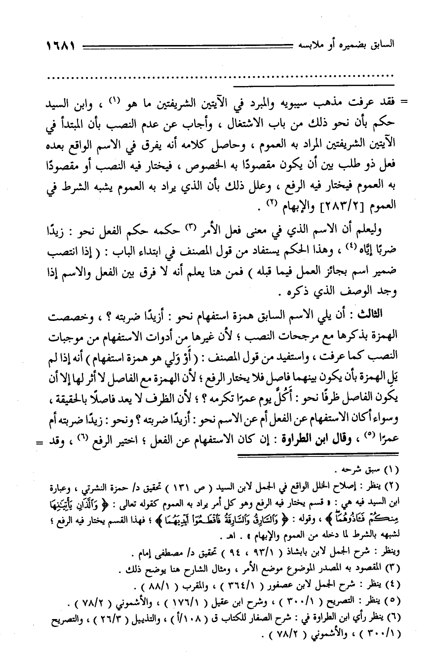 (¬2) ينظر: إصلاح الخلل الواقع في الجمل لابن السيد (ص 131) تحقيق د/ حمزة النشرتي، وعبارة ابن السيد فيه هي: «قسم يختار فيه الرفع وهو كل أمر يراد به العموم كقوله تعالى: وَالَّذانِ يَأْتِيانِها مِنْكُمْ فَآذُوهُما، وقوله: وَالسَّارِقُ وَالسَّارِقَةُ فَاقْطَعُوا أَيْدِيَهُما؛ فهذا القسم يختار فيه الرفع؛ لشبهه بالشرط لما دخله من العموم والإبهام». اه.