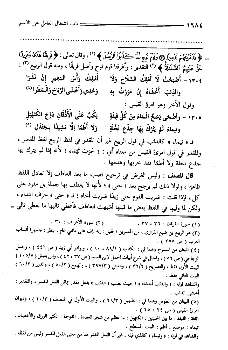فـ «تيماء» كالذئب في قول الربيع غير أن المقدر في لفظ الربيع لفظ المفسر، والمقدر في قول امرئ القيس من معناه أي: «خرب تيماء؛ لأنه إذا لم يترك بها جذع نخلة ولا أطما فقد خربها وهدمها.