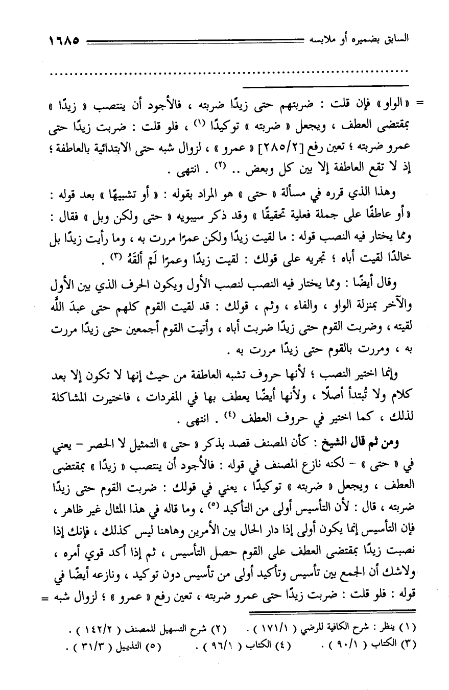 «الواو» فإن قلت: ضربتهم حتى زيدا ضربته، فالأجود أن ينتصب «زيدا» بمقتضى العطف، ويجعل «ضربته» توكيدا (¬1)، فلو قلت: ضربت زيدا حتى عمرو ضربته؛ تعين رفع [2/ 285] «عمرو»، لزوال شبه حتى الابتدائية بالعاطفة؛ إذ لا تقع العاطفة إلا بين كل وبعض .. (¬2). انتهى.