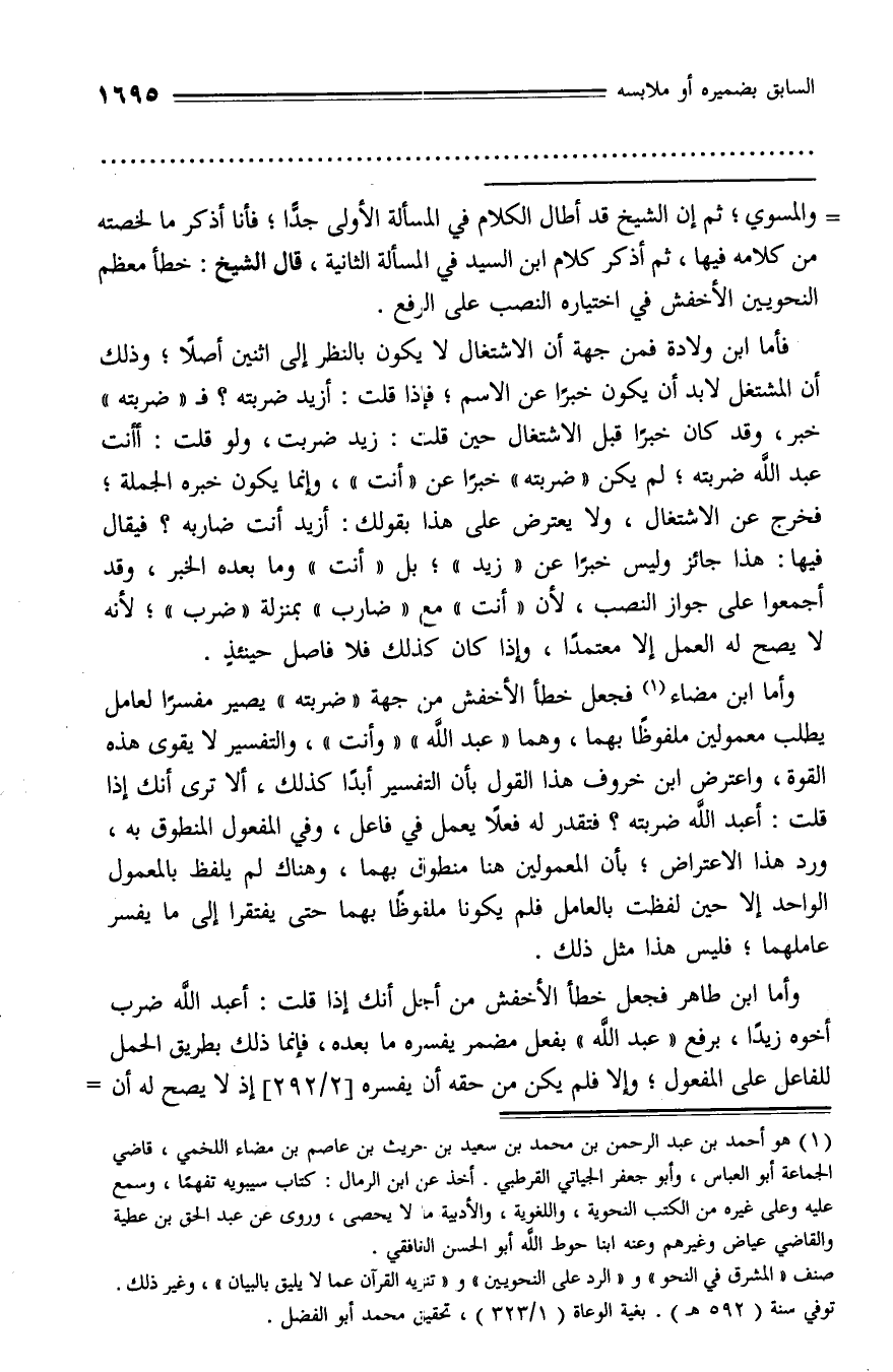 وأما ابن مضاء (¬1) فجعل خطأ الأخفش من جهة «ضربته» يصير مفسرا لعامل يطلب معمولين ملفوظا بهما، وهما «عبد الله» «وأنت»، والتفسير لا يقوى هذه القوة، واعترض ابن خروف هذا القول بأن التفسير أبدا كذلك، ألا ترى أنك إذا قلت: أعبد الله ضربته؟ فتقدر له فعلا يعمل في فاعل، وفي المفعول المنطوق به، ورد هذا الاعتراض؛ بأن المعمولين هنا منطوق بهما، وهناك لم يلفظ بالمعمول الواحد إلا حين لفظت بالعامل فلم يكونا ملفوظا بهما حتى يفتقرا إلى ما يفسر عاملهما؛ فليس هذا مثل ذلك.